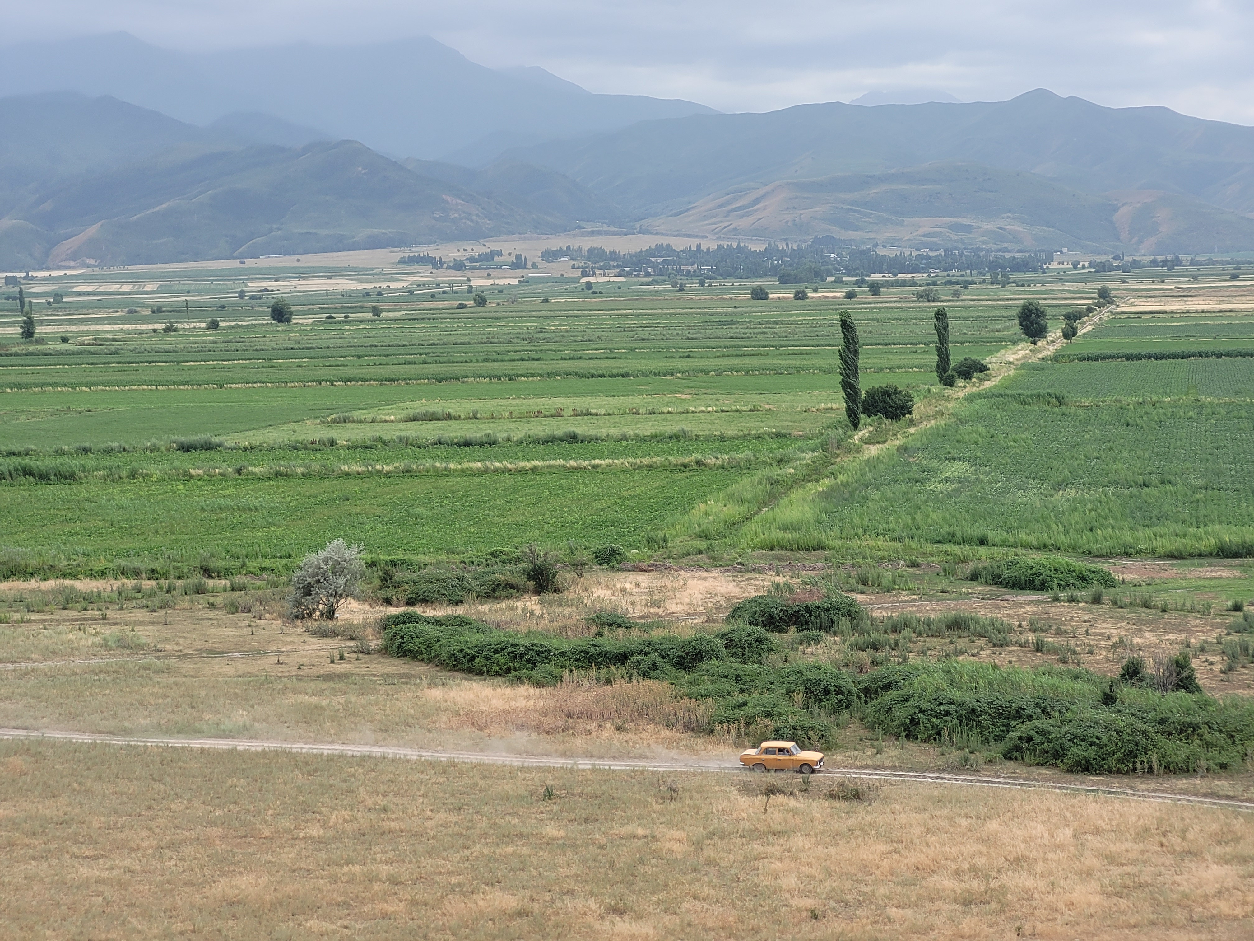 My favourite photo from the last day (and maybe the whole two weeks) was taken just before we left Burana. Whilst Ruslan was cooling down in the passenger seat of the taxi, I went for a wander. There, on the side of the road, was an intricately designed Soviet bus shelter (National in form, socialist in content), starkly geometric. Behind it loomed the tower, and just in the corner of my view stood a yurt, where a few minutes earlier I’d chatted to a lady selling kymys and feltwork to the few tourists on site. Silk Road, nomadic and Soviet, influences stretching back hundreds of years, still standing today in the landscape that had both shaped and been shaped by them. And living within them, between them, visiting them, using them, are people.