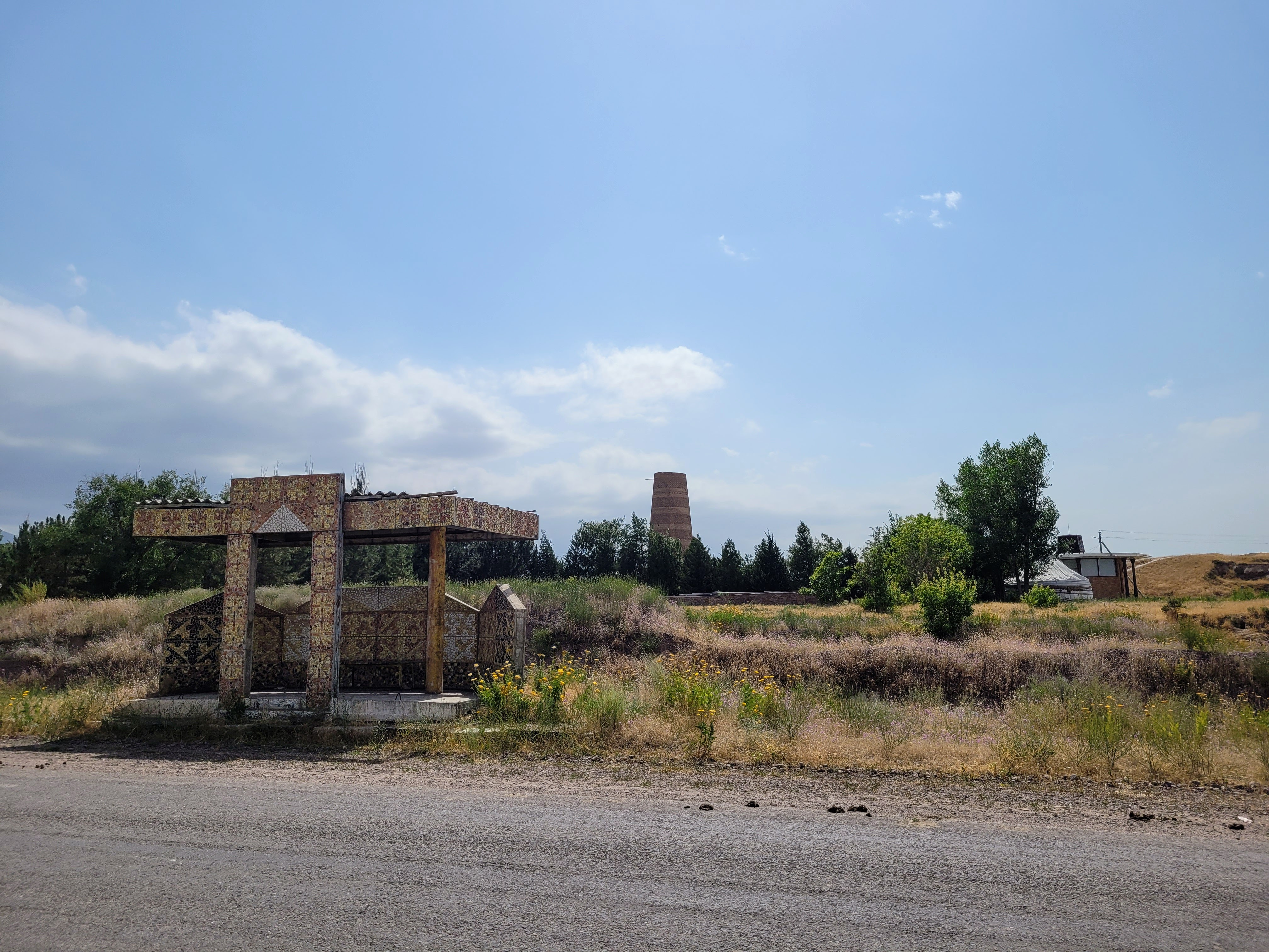 My favourite photo from the last day (and maybe the whole two weeks) was taken just before we left Burana. Whilst Ruslan was cooling down in the passenger seat of the taxi, I went for a wander. There, on the side of the road, was an intricately designed Soviet bus shelter (National in form, socialist in content), starkly geometric. Behind it loomed the tower, and just in the corner of my view stood a yurt, where a few minutes earlier I’d chatted to a lady selling kymys and feltwork to the few tourists on site. Silk Road, nomadic and Soviet, influences stretching back hundreds of years, still standing today in the landscape that had both shaped and been shaped by them. And living within them, between them, visiting them, using them, are people.
