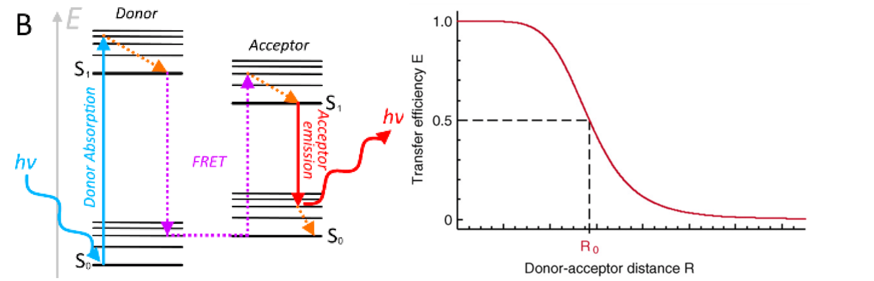 On the left diagram, we see FRET depicted. So for a brief overview of how FRET works, when we excite the donor fluorophore, we observe FRET between the emission of the donor and the excitation of the acceptor, and we can measure the emission of the acceptor. On the right we see the correlation between FRET transfer efficiency; when the distance between the fluorophore is short, the FRET efficiency is high, and when the distance is large, the FRET efficiency is low. I labeled PKA-C with Cy3 fluorophore and smoothened with Cy5 fluorophore and observed the changes in the FRET efficiency as the two proteins interact.