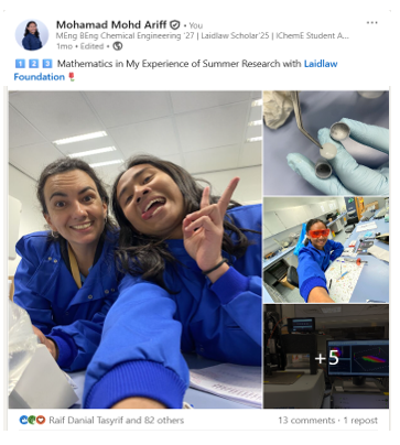As part of my personal journal, I had made a recap post in my LinkedIn profile to share bits of my experience and research content with my audience spanning from various parts of the world. I recounted every stage I embraced throughout the period and made a creative and insightful post using mathematical form. Some celebrated, liked and commented. All of them were positive and fulfilling since the research journey itself had concluded with abundant behind-the-scenes challenges that I could not describe. I also participated in 2025 Research Photo Contest hosted in Laidlaw Scholars Global Community through WhatsApp where participants were required to share their memorable moments during the period with research descriptions.