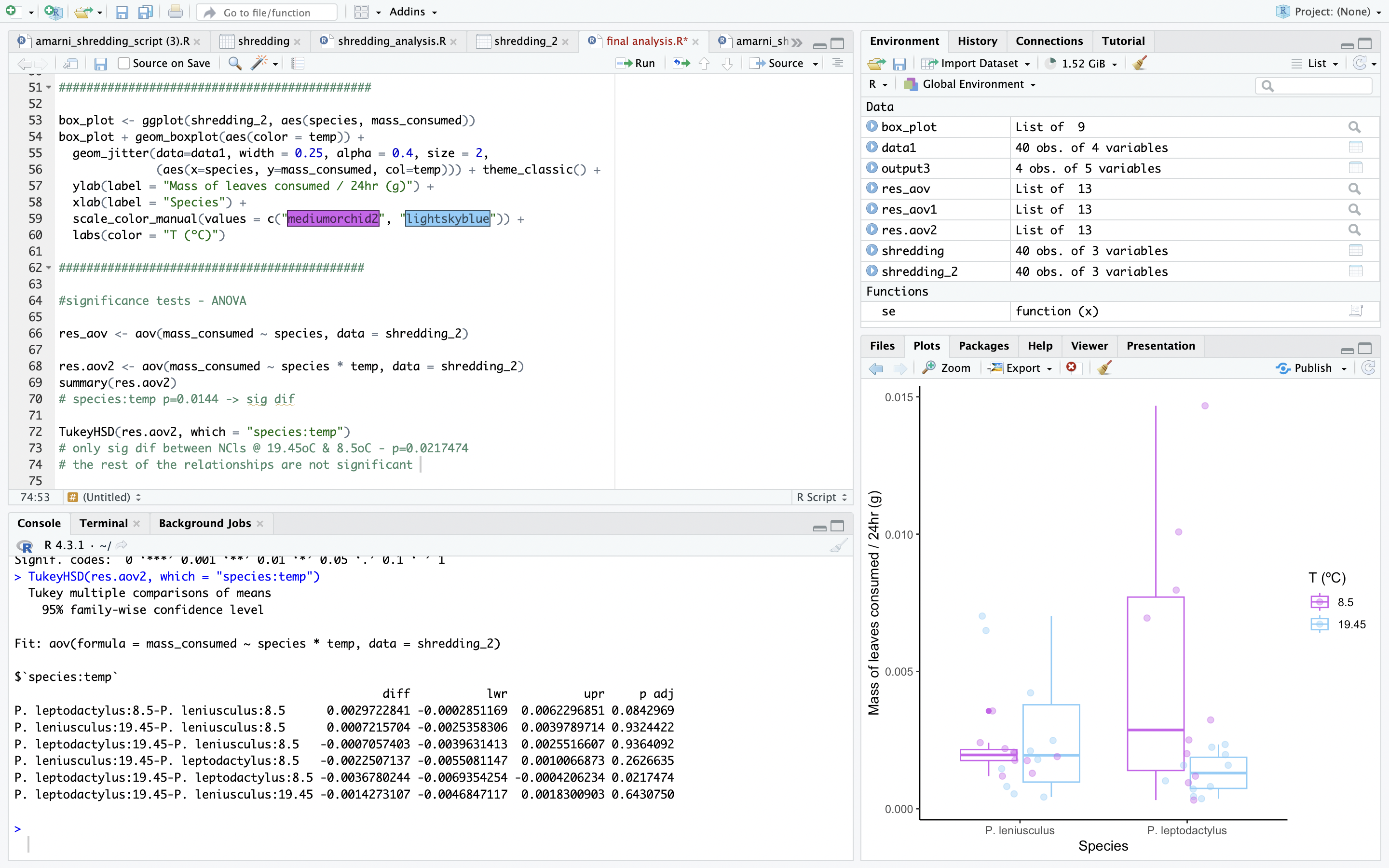 In ecology, the coding programme 'R' is used for data analysis and visualisation. I met with my supervisor, who was thrilled with my results, to get to terms with this coding business. Firstly, I was very grateful for her enthusiasm about my work, as it gave me the sense that my data was in fact valuable and useable. I watched her play around with the data, giving me the advice to play around with graphs first, as it gives a general sense of the relationship of the data sets. I tried to drink in all the code lines she was writing to get a general sense of what I would be doing when I left her office. Thankfully, my supervisor sent me off with her own code script, which was an invaluable jumping off point for my own fiddle with the data.
