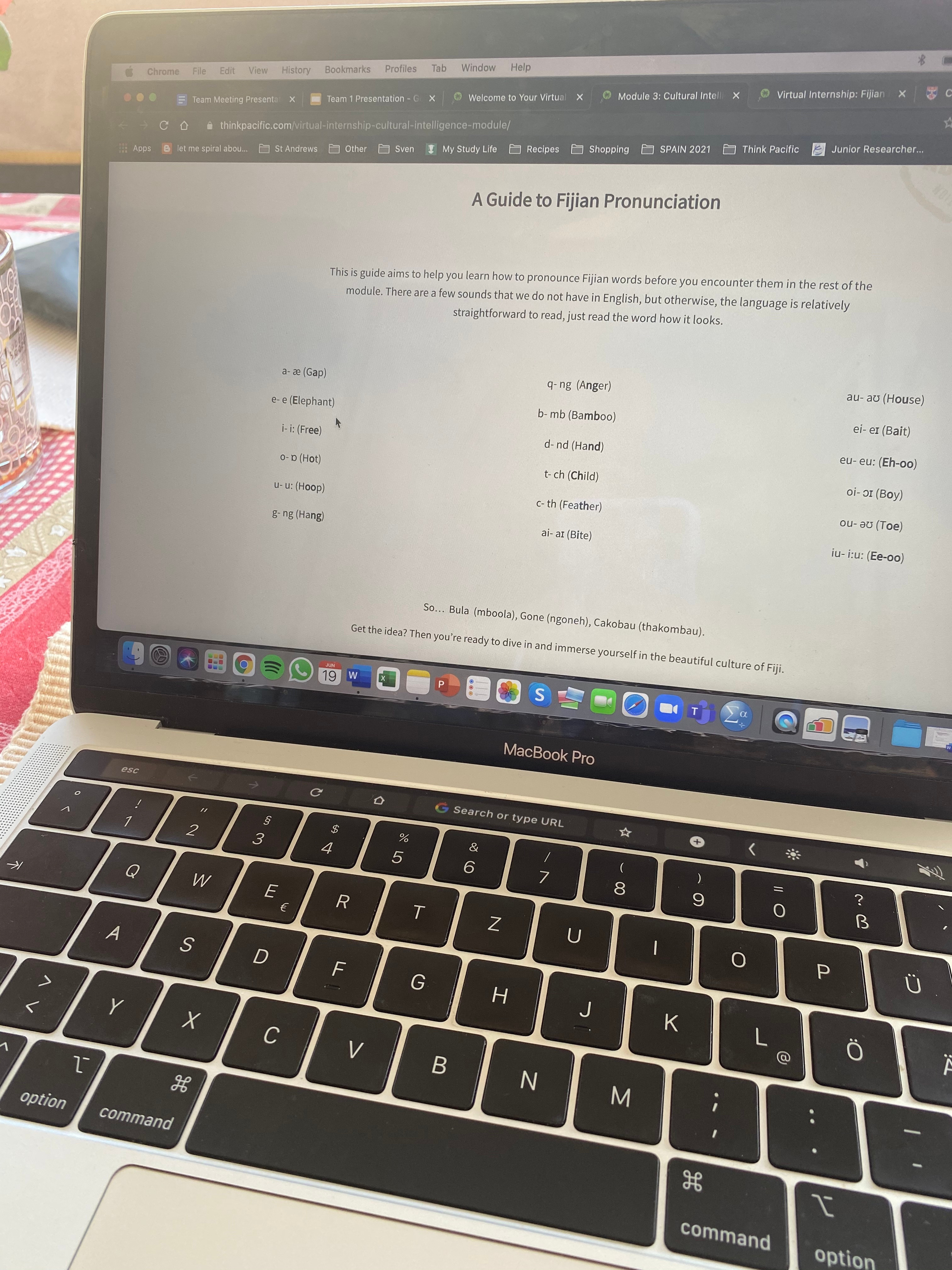 While it has been definitely challenging, the Think Pacific project has also been hugely rewarding. My favourite part has definitely been immersing myself into Fijian culture and learning all about its rich history! Despite all the content being delivered virtually, I think Think Pacific has done a phenomenal job of still making the information engaging and accessible. In the picture below you can see me enjoying my morning with a bit of Fijian pronunciation. How cool that the Think Pacific team included this!