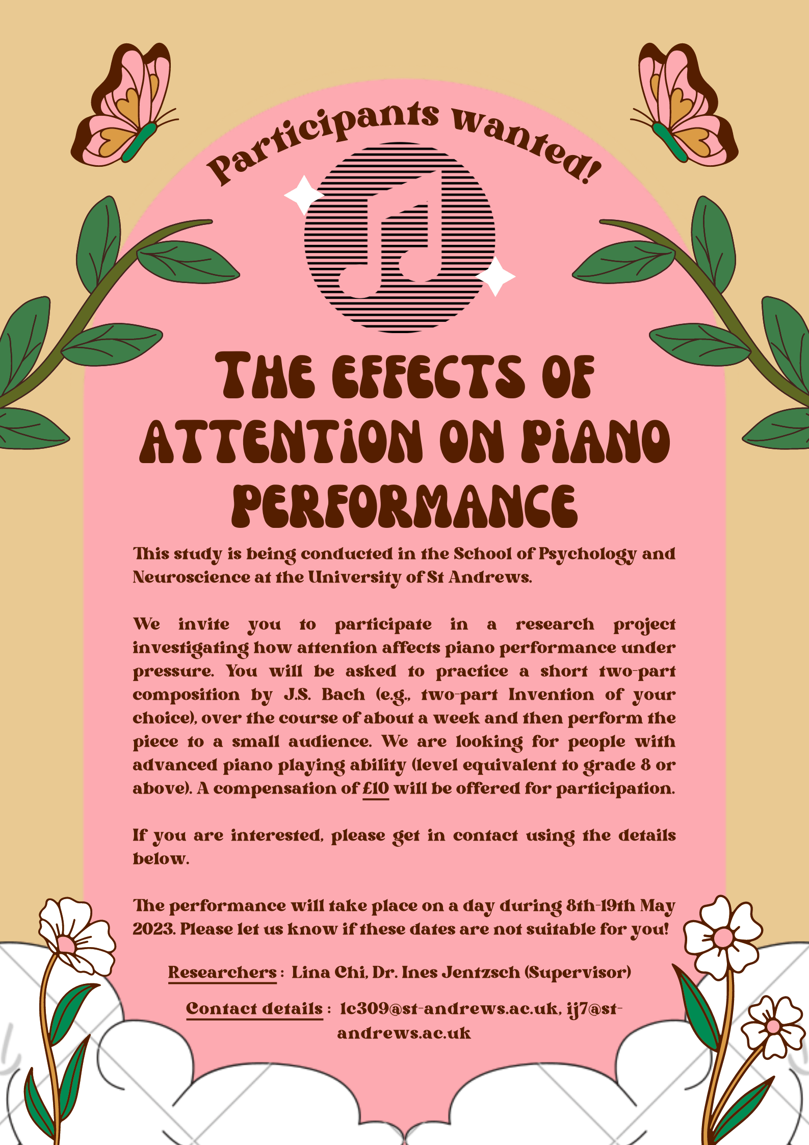 I expected participant recruitment to go smoothly, and it did… in the beginning. The participants we were looking for were quite niche – pianists with Grade 8 (ABRSM) qualification or higher. With students starting to go home for the summer holidays, I knew to keep my expectations low. My supervisor and I had agreed that we wanted to continue our study even after the 6 weeks and into the 2023-24 academic year, so there wasn’t a huge pressure on me to recruit a lot of participants over the summer. However, I still wanted at least five participants to conduct my summer research with.
