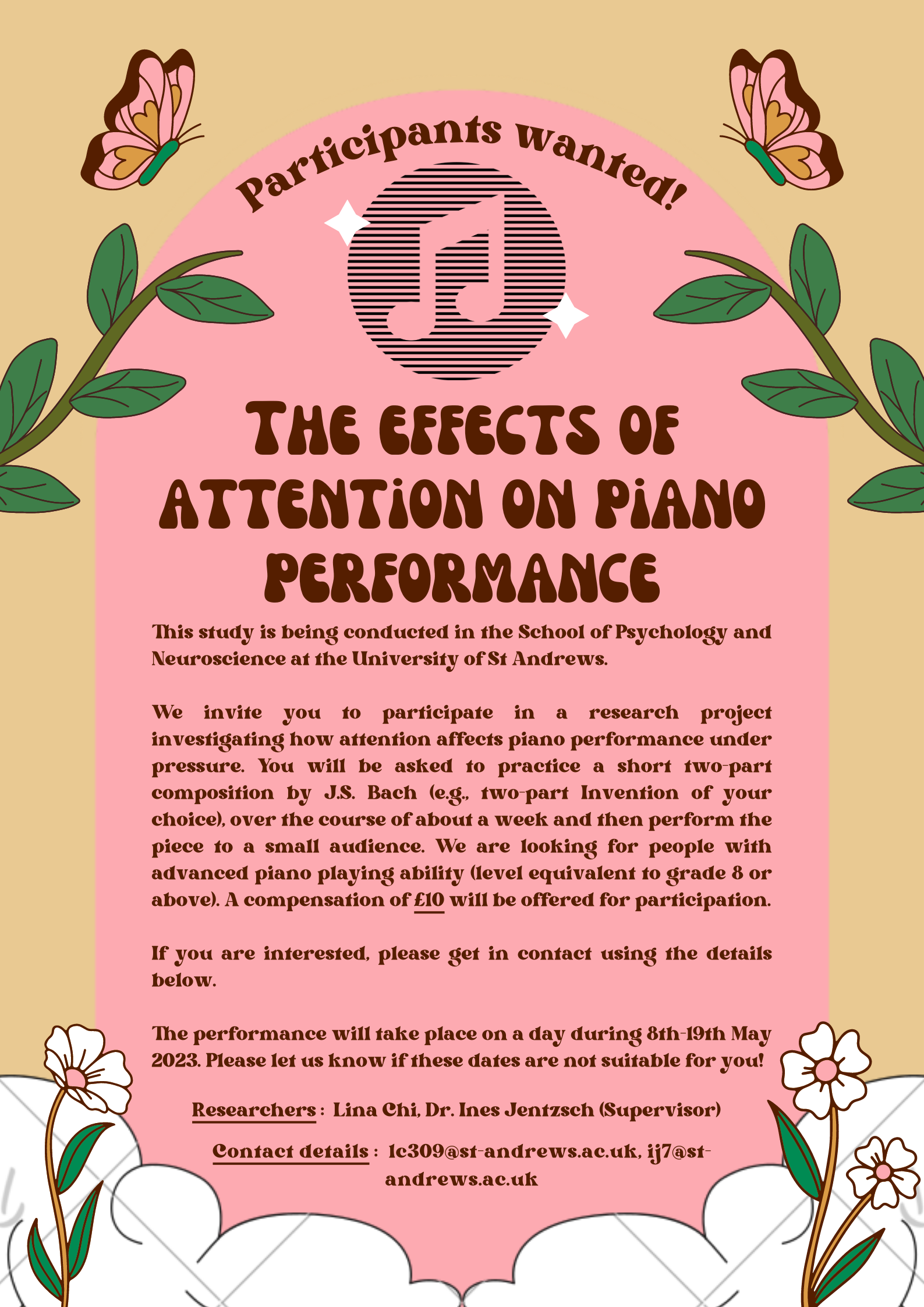 My supervisor had conducted a study which looked into the effects of attention focus on amateur piano performance, and found that external attentional focus (focusing on the sound the music produces) resulted in better performance compared to internal attentional focus (focusing on the finger movements). The study concluded this difference in attentional focuses could potentially be used as a performance anxiety intervention. Thus, for my research project, I wanted to look specifically at performance anxiety within pianists and see whether a difference in attentional focus impacts performance anxiety levels. If we do find that external attentional focus leads to lower performance anxiety levels (as previous literature suggests), it may be applied to fields other than music education, for example, sports and public speaking. The interdisciplinary nature of my research project and its wide scope has been a consistent factor in motivating me through my research journey so far.
