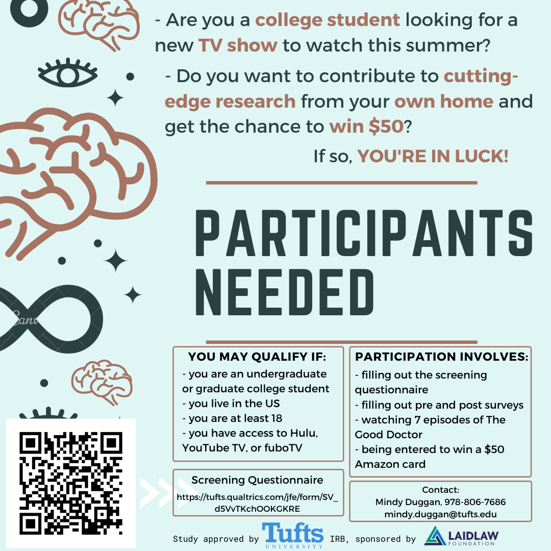 To learn more about eligibility and to fill out the screening questionnaire, click the following link: https://tufts.qualtrics.com/jfe/form/SV_d5VvTKchOOKGKR or scan the QR code on the flyer. By filling out this screening questionnaire, you are not committing to participation— I will reach back out with more information if you are determined to be eligible. Spread the word to others you know who may be eligible and interested— I am looking for a diverse range of participants from those with autism to those who have had no contact with the autism community!