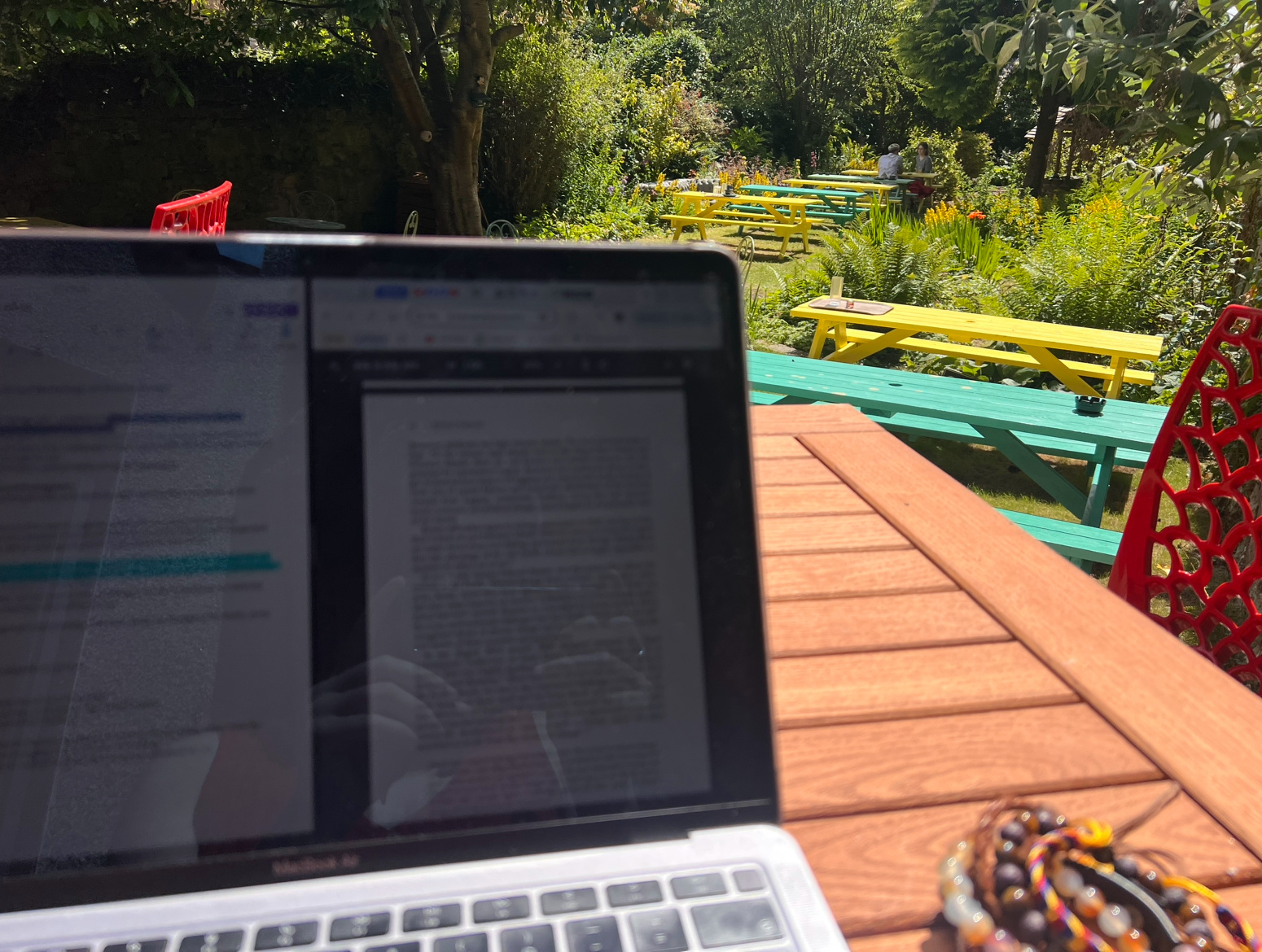 Sat on this balcony now, I can trace the story of these changing perspectives throughout the previous months by picturing the perspectives from each view I have had while writing. Space café in St Andrews, St Mary’s library, my desk in the spare bedroom at home, my local Cathedral reading room, my balcony on holiday. Each is paired with my mental journey: a crisis of the scale of this research summer, a calmness in simply reading a new article each day, the looming fear of not having enough time to write, the quiet peace of forcing myself to steel my nerves, and finally…