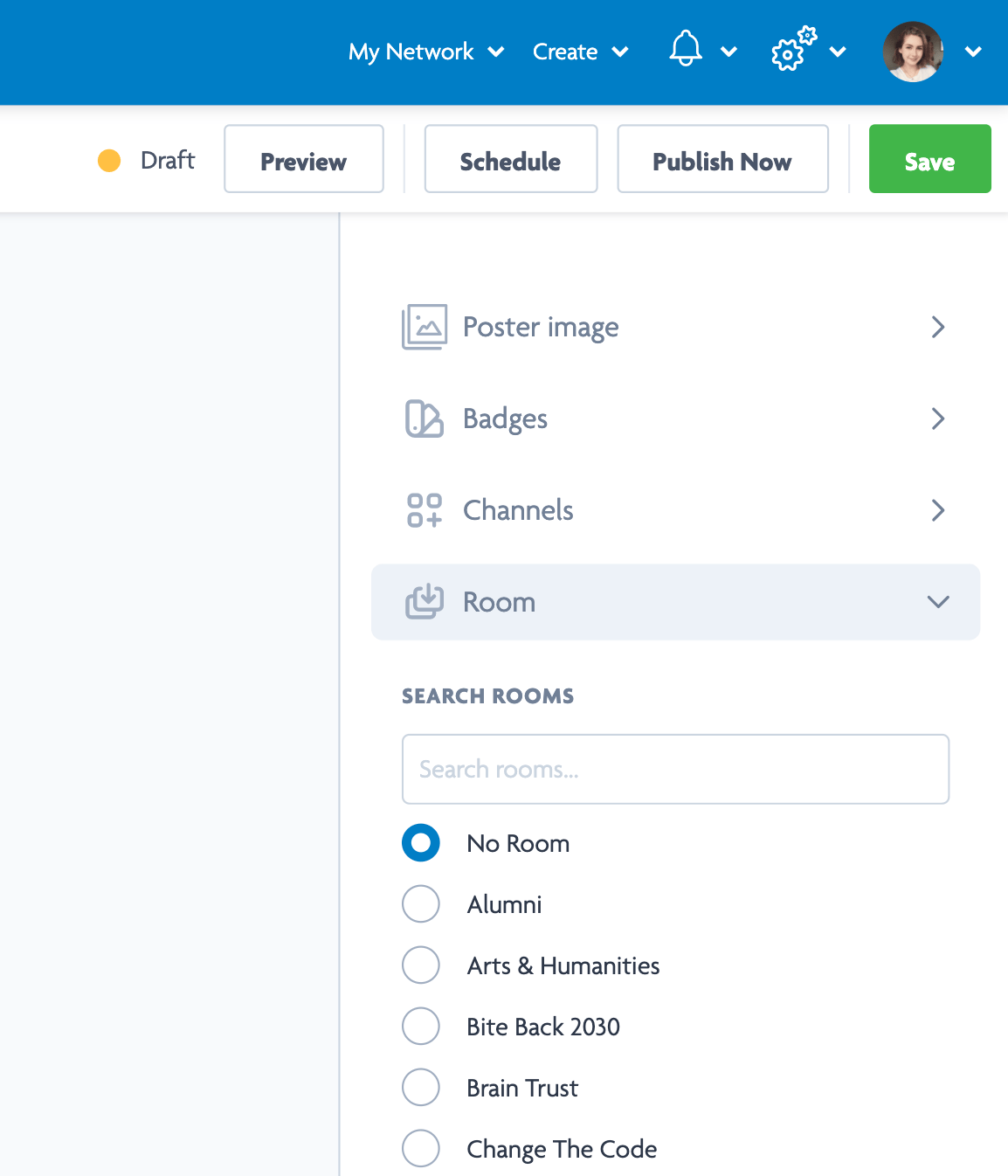 To post in a room, create a piece of content (post/video/document) like you normally would by clicking Create in the top right corner.