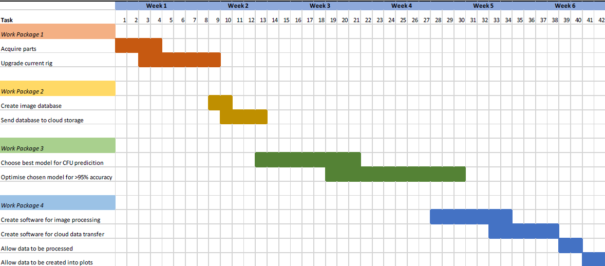 The creation of a working prototype that would fulfil the aims of the project can be realistically achieved in a six-week time frame. The project has four work packages. Each work package has been designed to be independent of the others. This ensures progress on each can be made concurrently, and that any delays incurred on a task only affect the work package they are in.