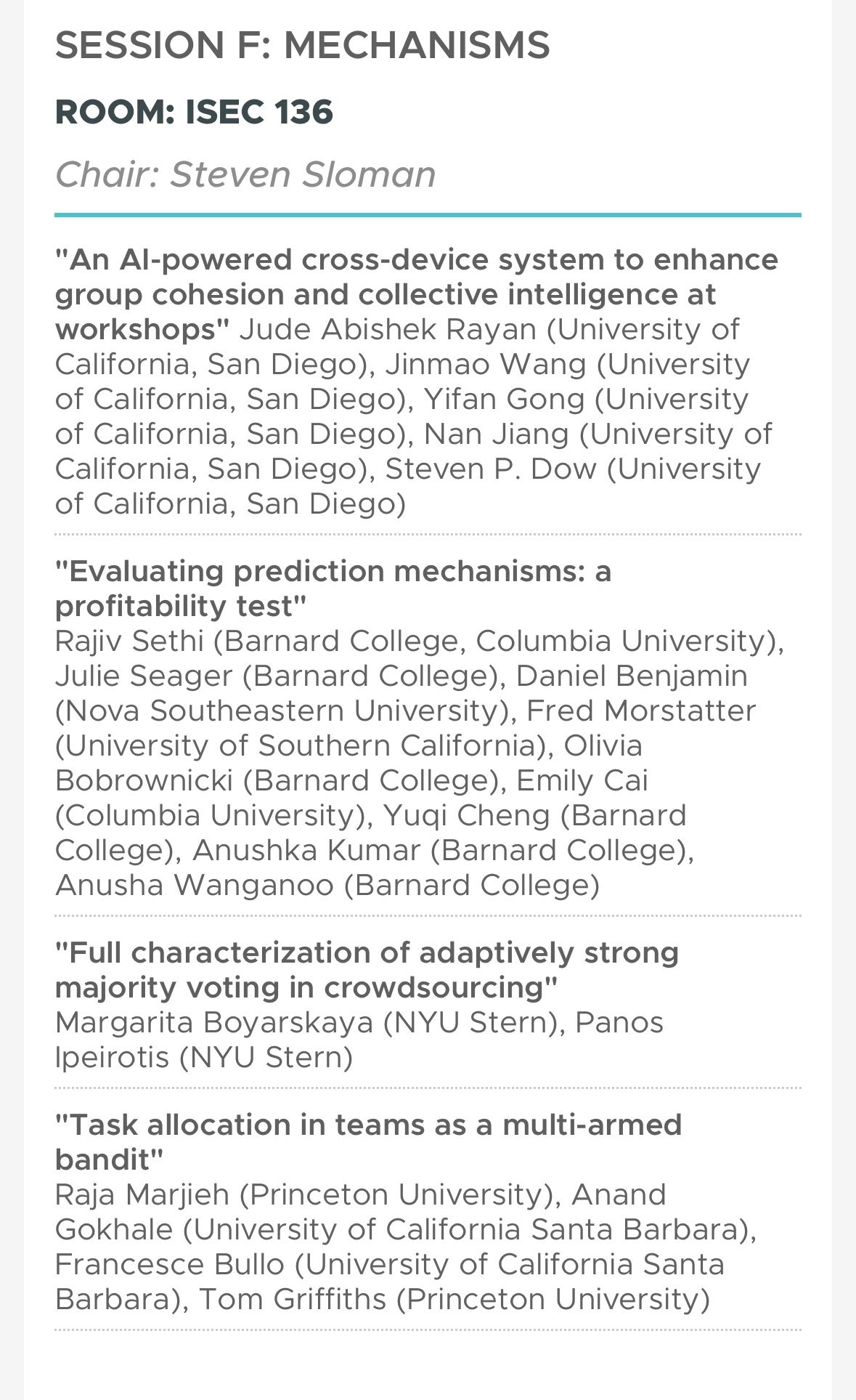 “Evaluating Prediction Mechanisms: A Profitability Test”, the paper that I co-authored with Prof. Rajiv Sethi and my teammates Yuqi Cheng and Anushka Kumar, was selected for presentation at the esteemed ACM Collective Intelligence Conference at Boston. It was a truly an experience of a lifetime to be able to have our work in a setting full of scholars, and immerse ourselves in multidisciplinary research and conversations of the future in fields such as wisdom of crowds, human-AI teams, and social biases.