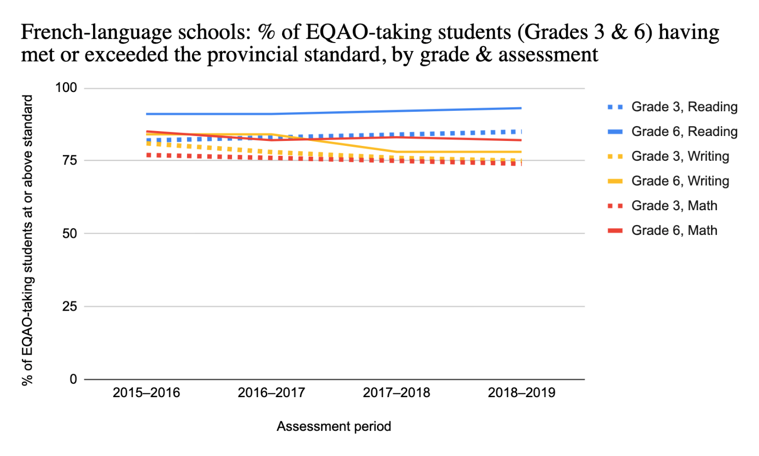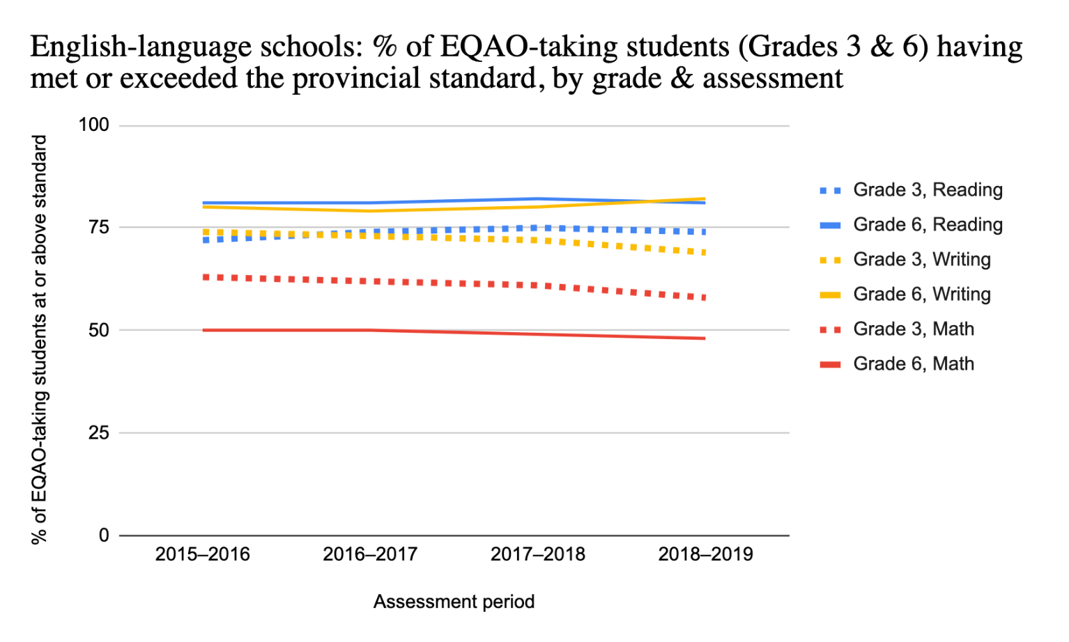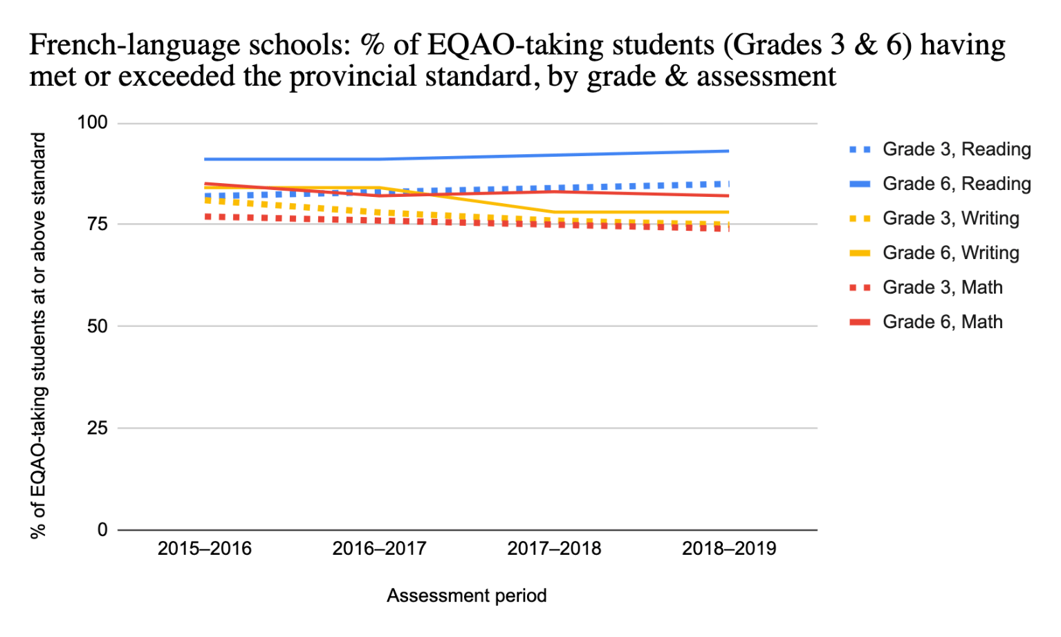 - How has this trend evolved over time from 2003–2019 and 2021–2022 (whereas the EQAO was cancelled from 2019–2021)?