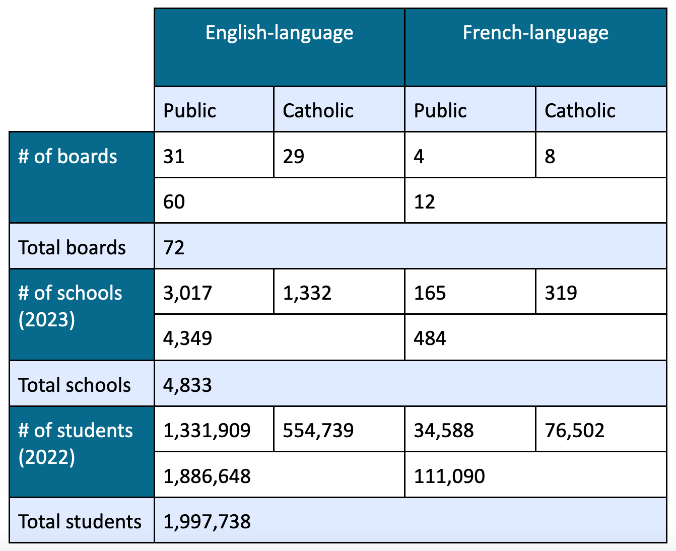 As shown in the above table, Ontario comprises four publicly funded school systems: English Public, English Catholic, French Public, and French Catholic. This table, which I created for my prior research project on the EQAO, highlights a significant size difference between English- and French-language systems, wherein there are approximately 17 times as many students enrolled in the former as in the latter. Data on the number of school boards and students enrolled are from the FAO's aforementioned 2022 data set, while data on the number of individual schools are from a Government of Ontario data set released in 2023. The FAO measures enrolment through Average Daily Enrolment, measured in turn by individual schools on count dates in October and March of each year.
