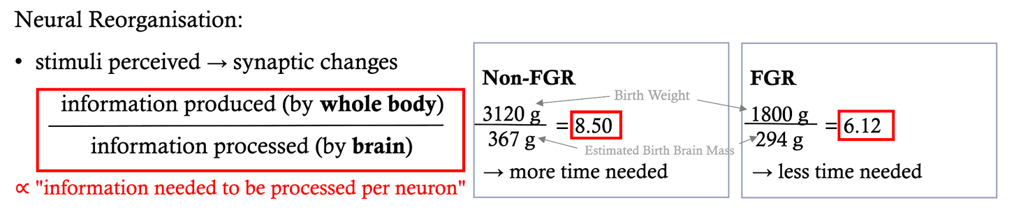 Figure 1. Numerical example of hypothesised effect of relative brain mass on neural reorganisation rate and REM sleep time required. The birth weight and estimated birth brain mass values of FGR and non-FGR newborn are each from one newborn of the actual dataset. The birth brain mass is estimated from birth head circumference using Cooke et al., (1977)’s model. Because FGR newborns have a lower body-to-brain mass ratio, which in theory is proportional to the amount of information needed to be process by each neuron, we expect neural reorganisation rate to be higher in FGR newborns, and therefore less REM sleep would be required.