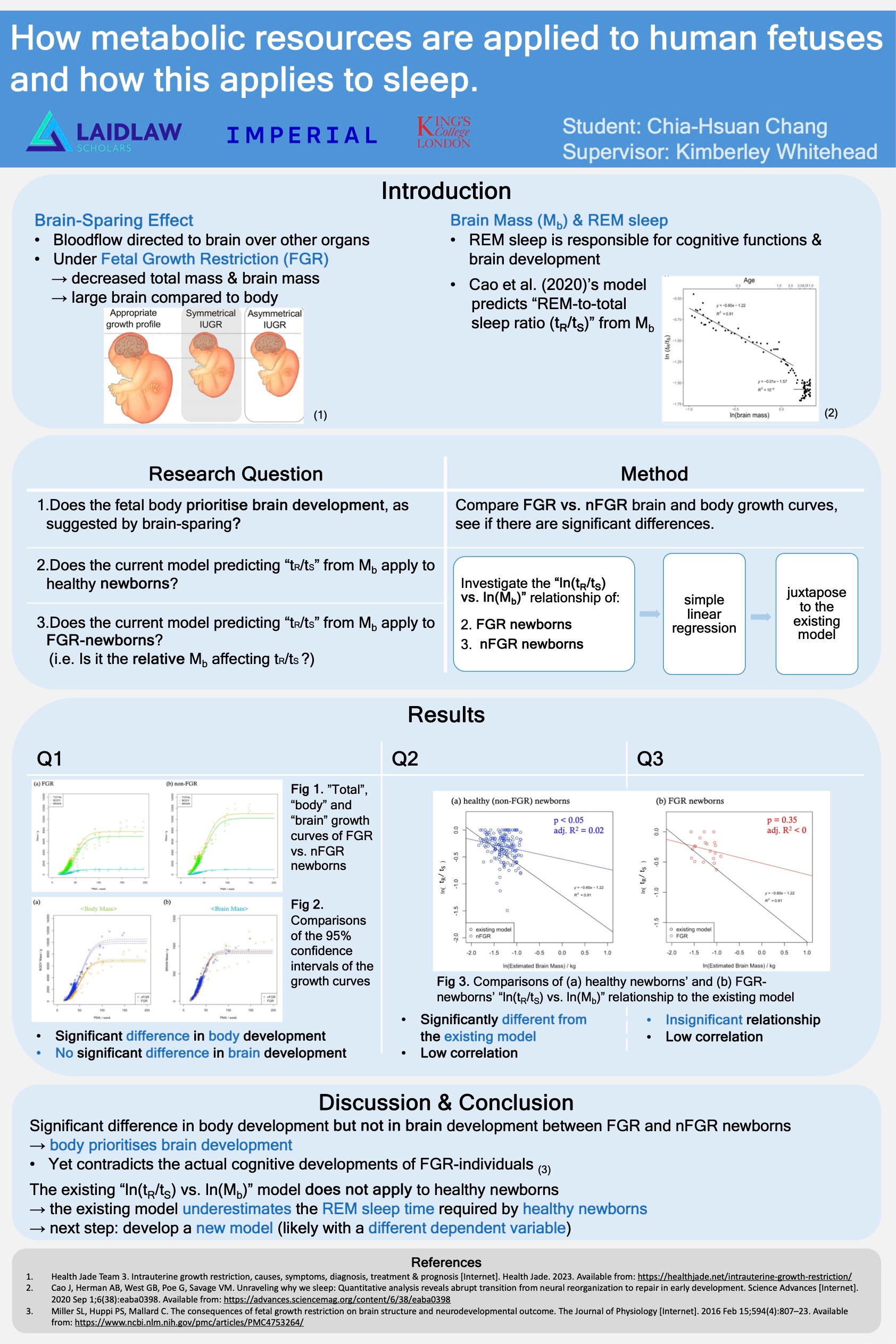 Neural reorganisation, which REM sleep is responsible for, is the process of transferring stimuli perceived during awake time into synaptic changes (Cao et al., 2020). Because stimuli can be perceived by the entire body surface area (for example, the somatosensory sensation) and the transferring of stimuli into synaptic changes is primarily done by the brain, it is questionable whether the rate of neural reorganisation and therefore the time required for REM sleep is dependent on the absolute brain size or the relative brain size compared to the overall body size. This leads to the third research question: ‘Is Cao et al. (2020)’s model predicting the “REM-to-total sleep ratio (tR/tS)” from brain mass accurate for FGR newborns?’