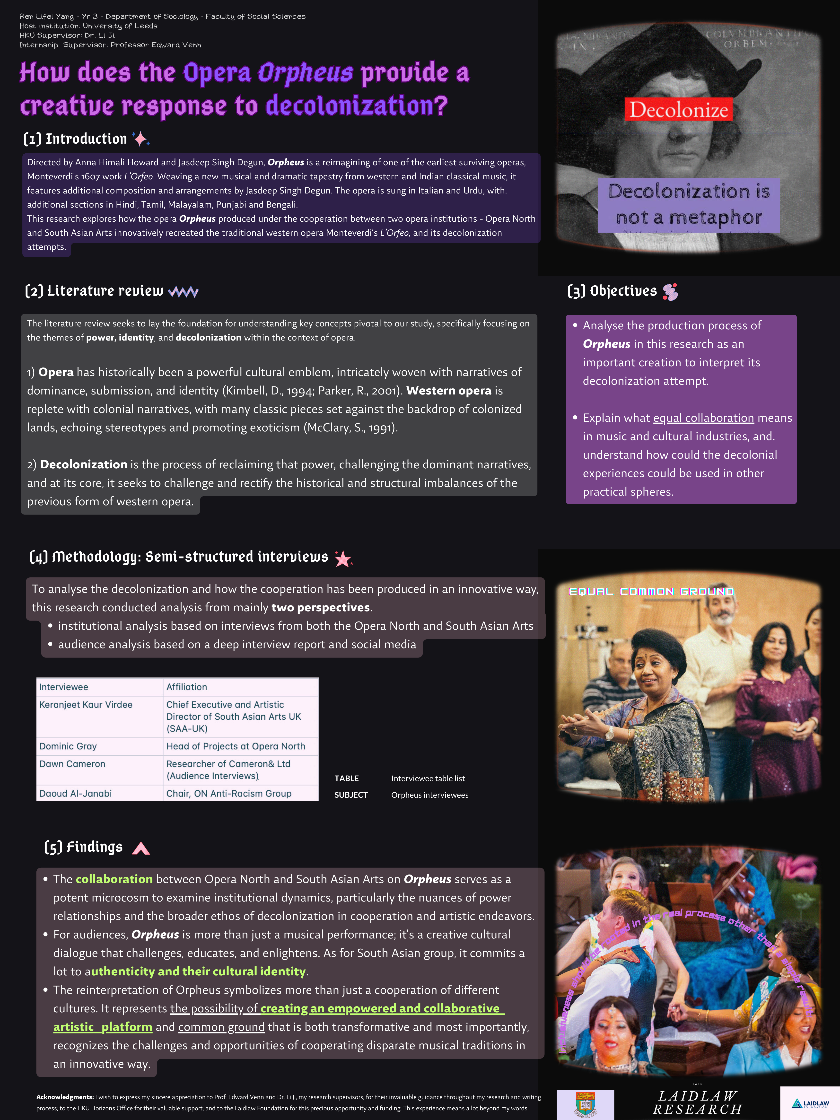 The project Telling Operatic Stories: Race, ethics, and authenticity, is centered on Opera North's upcoming productions of Orpheus. Orpheus, a collaboration with South Asian Arts UK and composer Jasdeep Singh Degun, reimagines Monteverdi's L'Orfeo. This project will combine opera analysis, contemporary music ethics, postcolonial studies, and critical theory, to explore encounters with diverse perspectives, memories, and future visions. It seeks to delve into the pressing issues of opera storytelling, audience reception, storytelling rights, and fostering authentic creative voices. By examining questions of who has the right to tell certain stories and how organizations facilitate or hinder genuine creative expression, the project aims to animate and underpin the discussions around these ethical dilemmas.