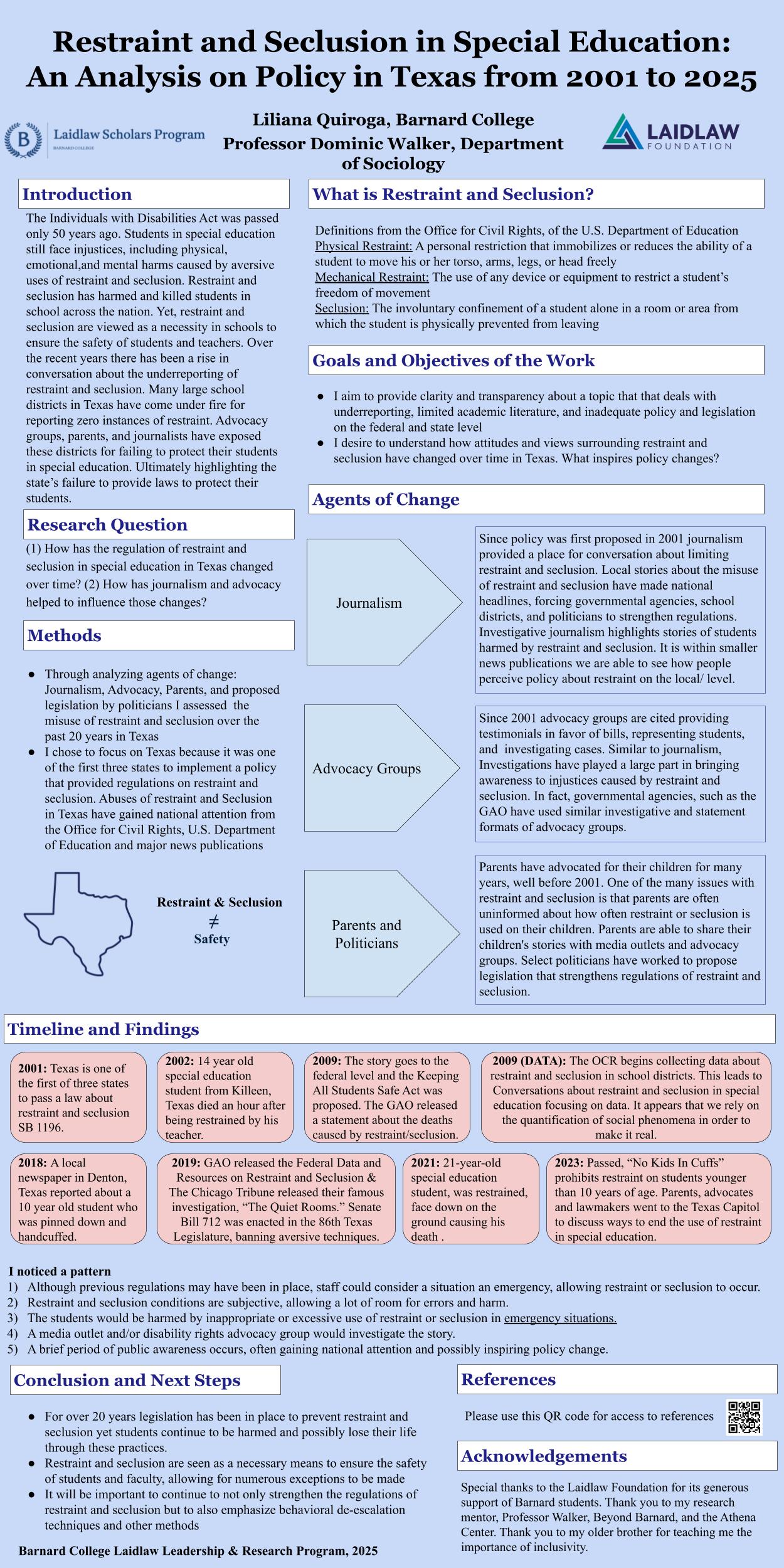 I am a rising sophomore, pre-law student at Barnard College, Columbia University intending to major in History and minor in Philosophy . My academic interests are civil rights law, ethics, intellectual history, education policy, and disability studies. As a Laidlaw scholar I draw from my academic interests and personal experiences to conduct research on the use of restraint and seclusion in special education. I am eager to use my research experience and education in my future law career to further social equality.