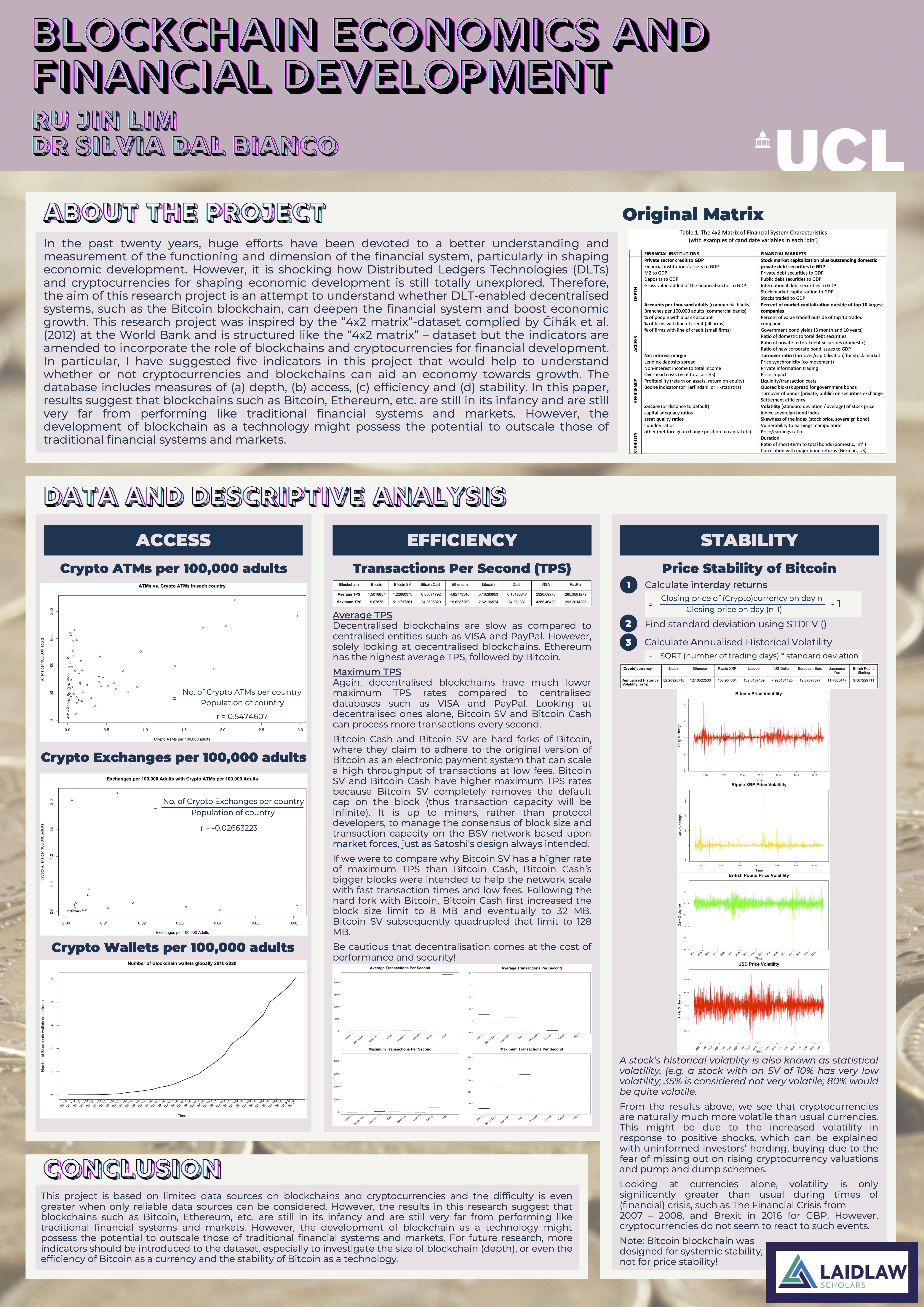 This is a poster summarising the results that I have found on blockchain economics and financial development. This research was inspired by the “4x2 matrix” dataset complied by Čihák et al. (2012) at the World Bank and was modified to take DLT-enabled decentralised systems into consideration.
