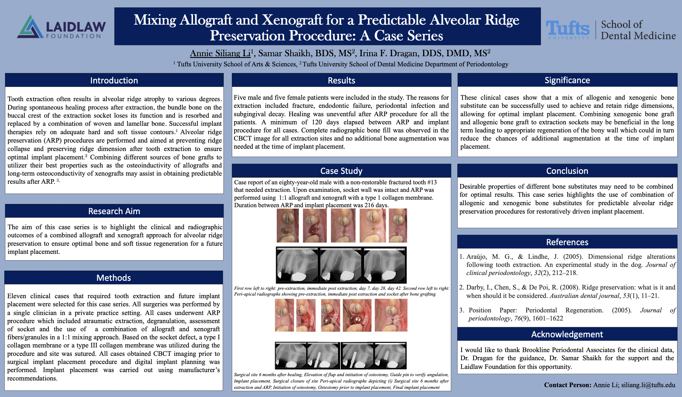 My name is Annie Li and I am a junior at Tufts University studying Biology and Community Health on my journey to dentistry. In the summer of 2022, I had the honor to be mentored by Dr. Irina Dragan of Tufts University School of Dental Medicine and studied the effect of the combination of allograft and xenograft for Alveolar Ridge Preservation. I want to sincerely thank all the mentors that supported my work and offered me guidance, especially my mentor Dr. Dragan, Dr. Samar Shaikh, everyone at Brookline Periodontal Associates (Brookline, MA, USA), Tufts Laidlaw staff, and the Laidlaw Foundation.