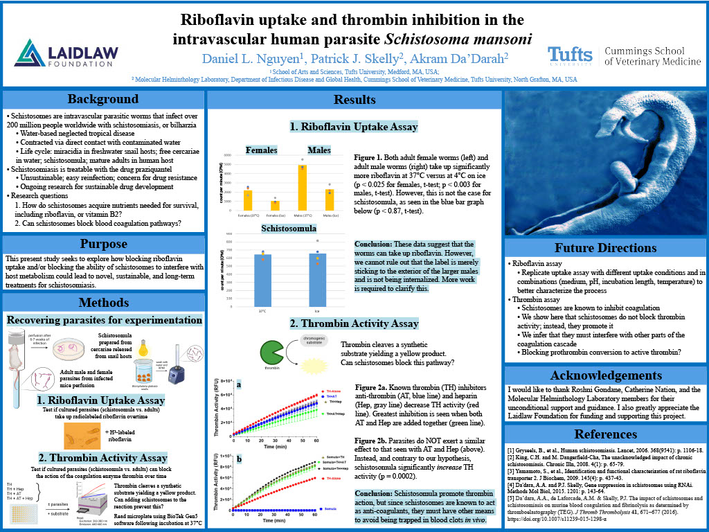 I would like to express my sincerest gratitude to Dr. Patrick Skelly and Dr. Akram Da'Darah for being incredible mentors and helping me in making this research project come to fruition. I also want to thank Roshni Gondane and Catherine Nation for their unconditional support and wisdom. Lastly, I want to thank the Laidlaw Foundation and the Tufts-Laidlaw team for supporting and funding this project! Here's to more research in infectious disease.