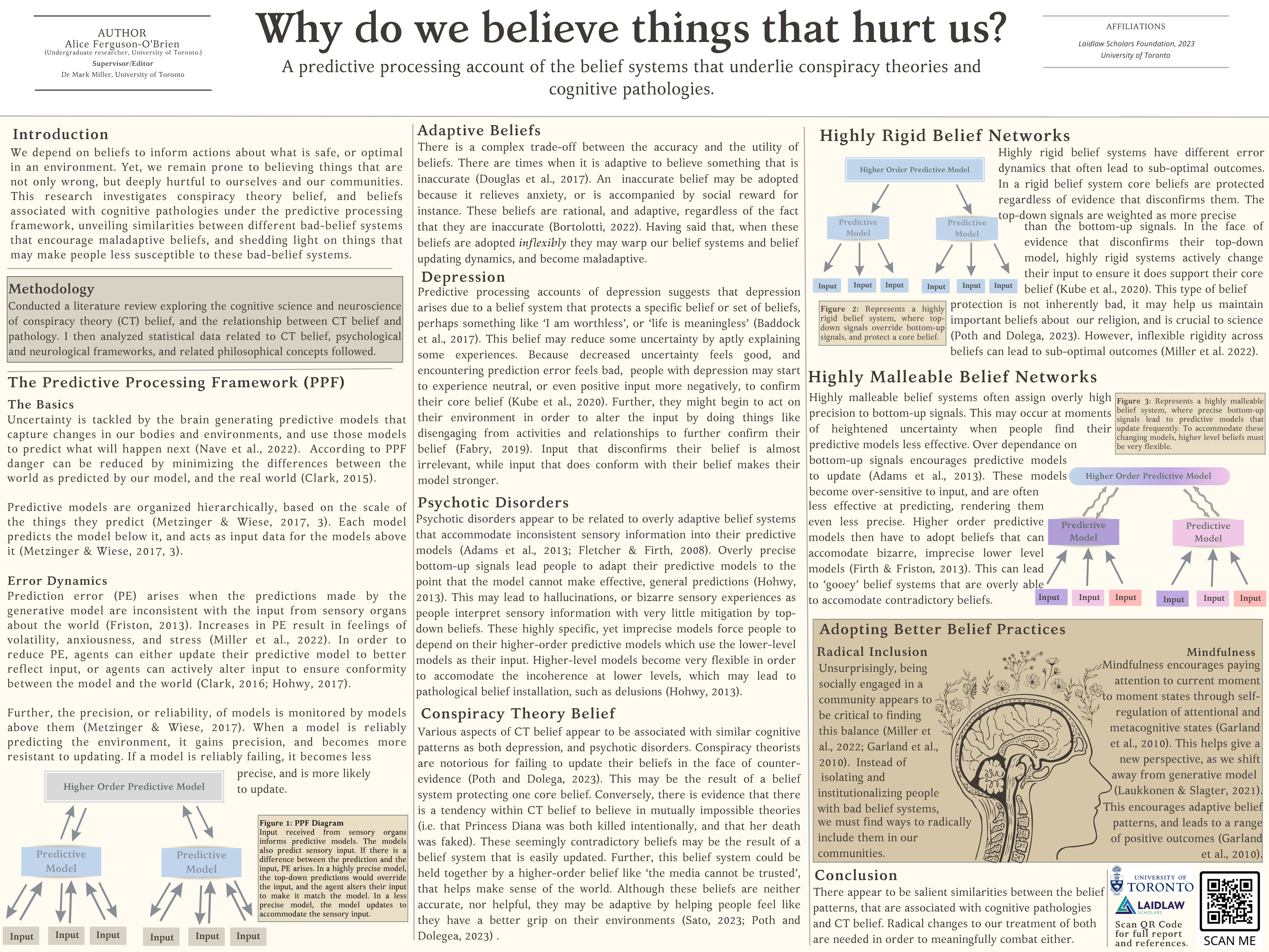 This research poster explores the cognitive science of conspiracy theories and cognitive pathologies, investigating some similarities between belief patterns associated with both, and proposing strategies to make individuals and communities less prone to both.