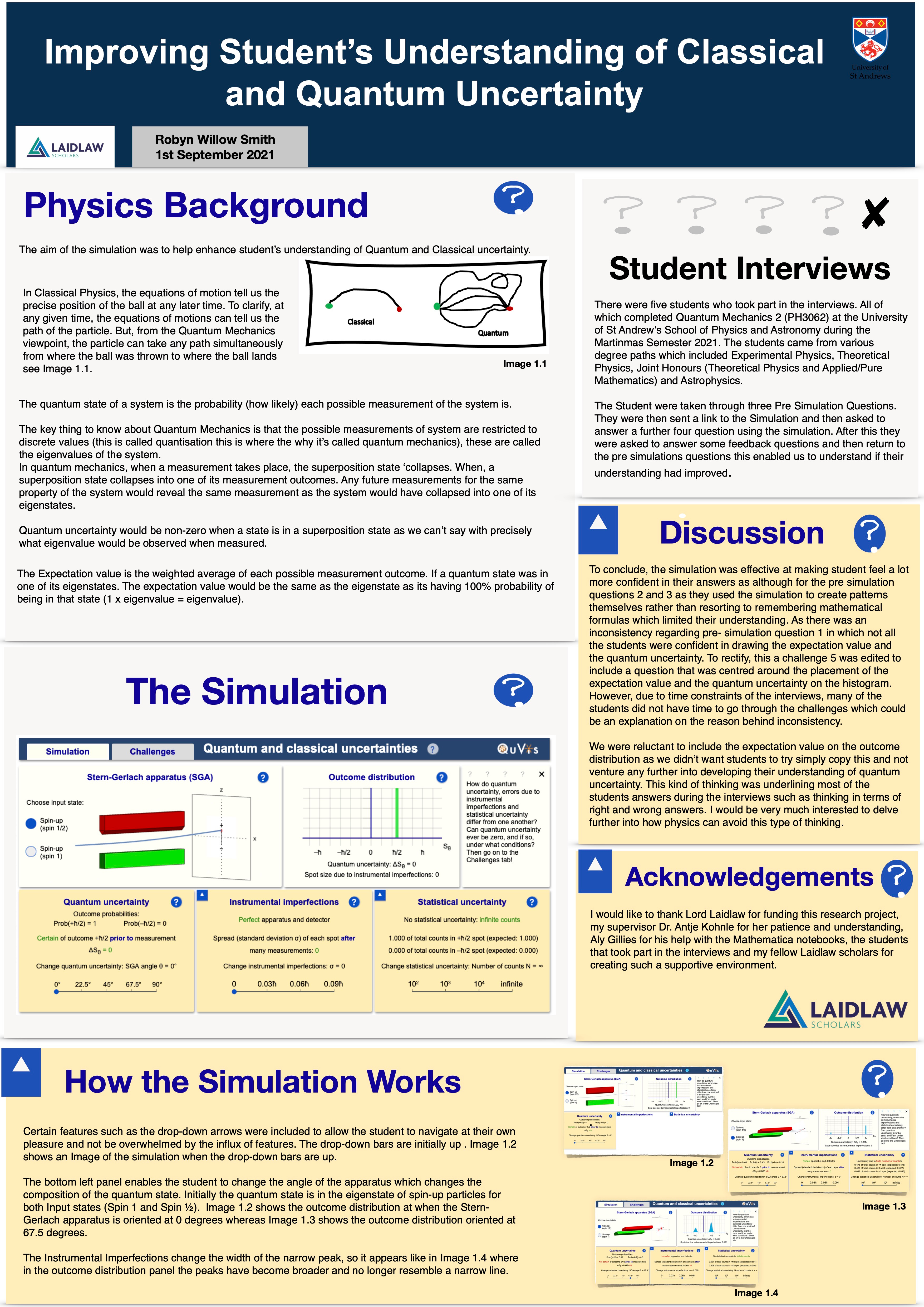 I am currently about to enter my fourth year of my Integrate Masters in Theoretical Physics and Applied Maths. My Laidlaw research project was part of QuVis ( The Quantum Mechanics Visualisation Project). In particular, I worked on the spin uncertainty stimulation and then investigated it's effectiveness by conducting student interviews. I have a wide range of interests including Unification theories, sustainable fashion, digital creative advertising , behavioural science and art amongst many more.