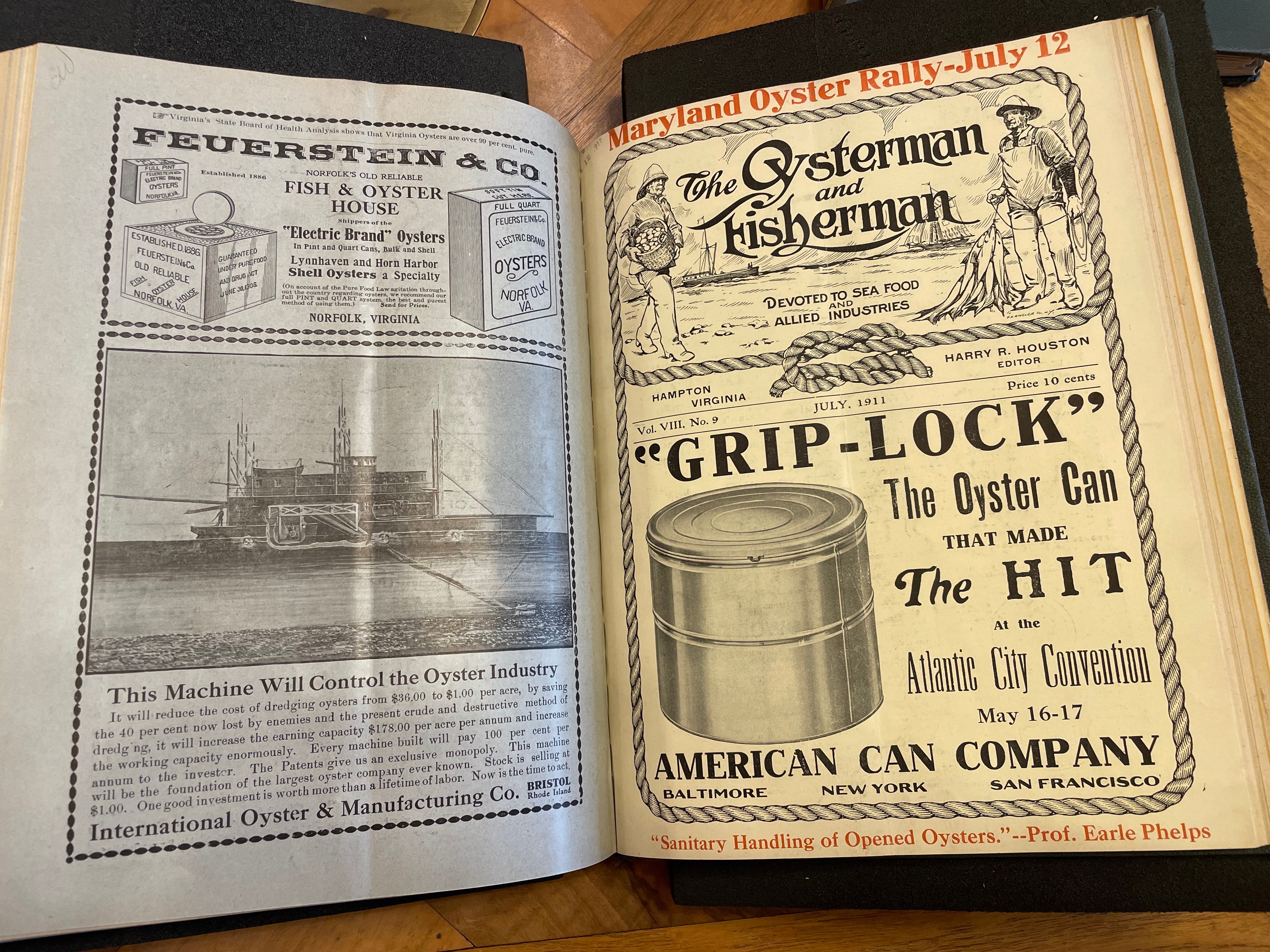 These were the first materials I viewed: copies of the Oysterman and Fisherman journal from 1906-1913, the one pictured from July 19ll, in the collection of the New York Public Library. These magazines convey the changing state of the oyster industry in the early 20th century, when mechanization and commercialization were increasingly pervasive, the demand for oysters high. Other articles in the magazines discuss conservation practices for dealing with declining oyster beds across the United States, demonstrating how oystermen were conscious of ecological change in this period.