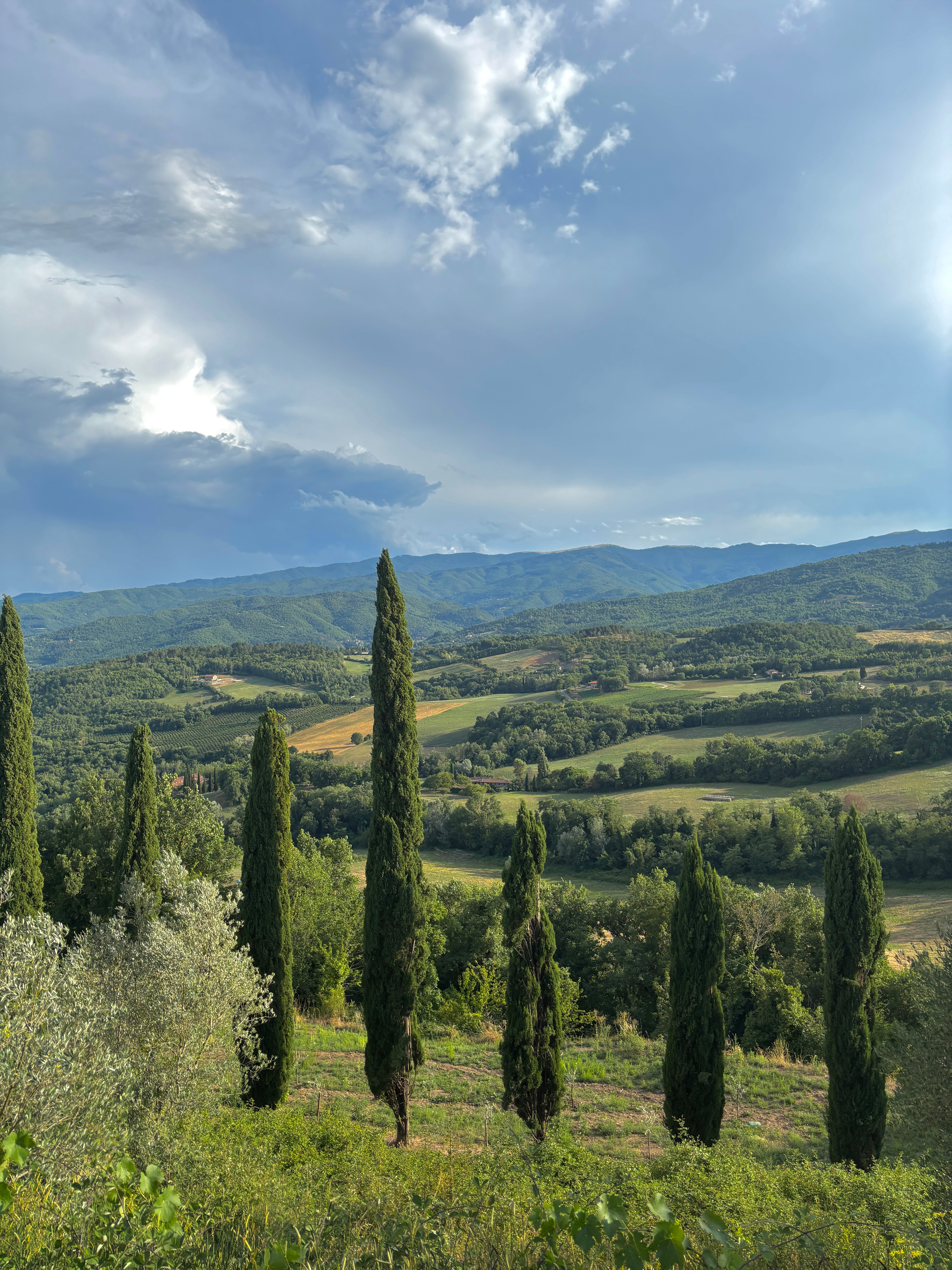 Image I: A view from one of my walks of the lush Tuscan hills whose soft appearance is characterised by the silver-green olive trees and tall mediterranean cypresses (the nature staples of Tuscany which you will see everywhere you go).