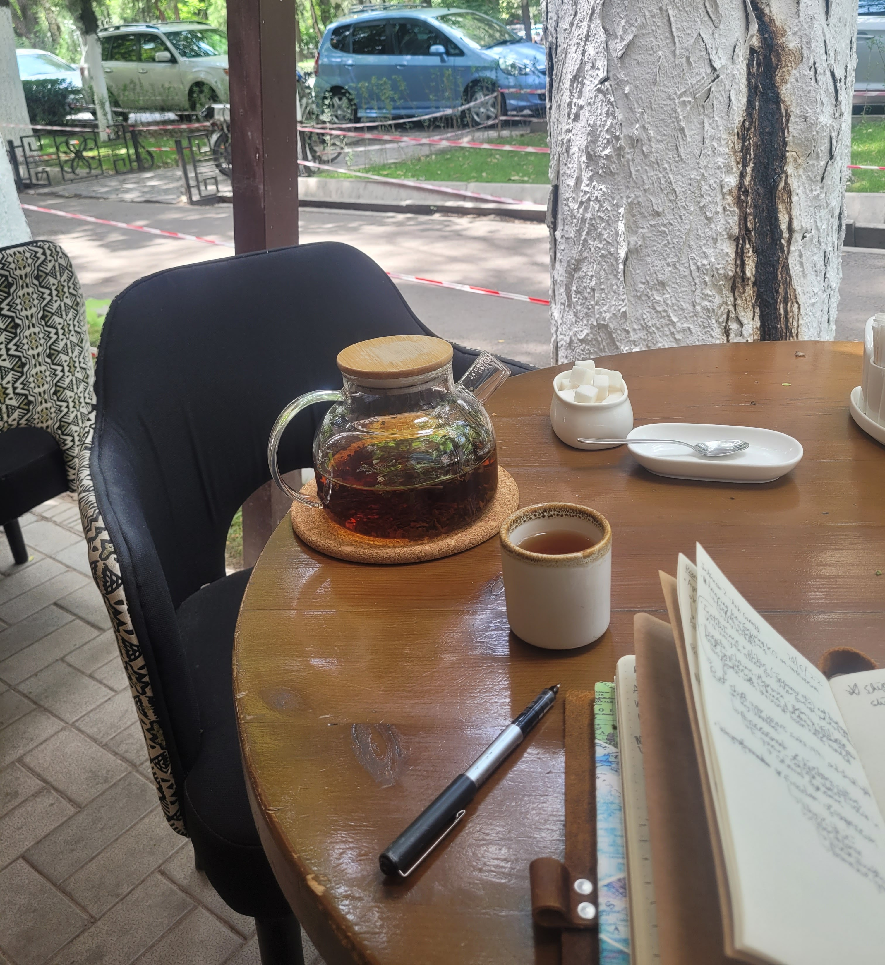 Writing up my fieldwork notes post-interview, fuelled by black tea.