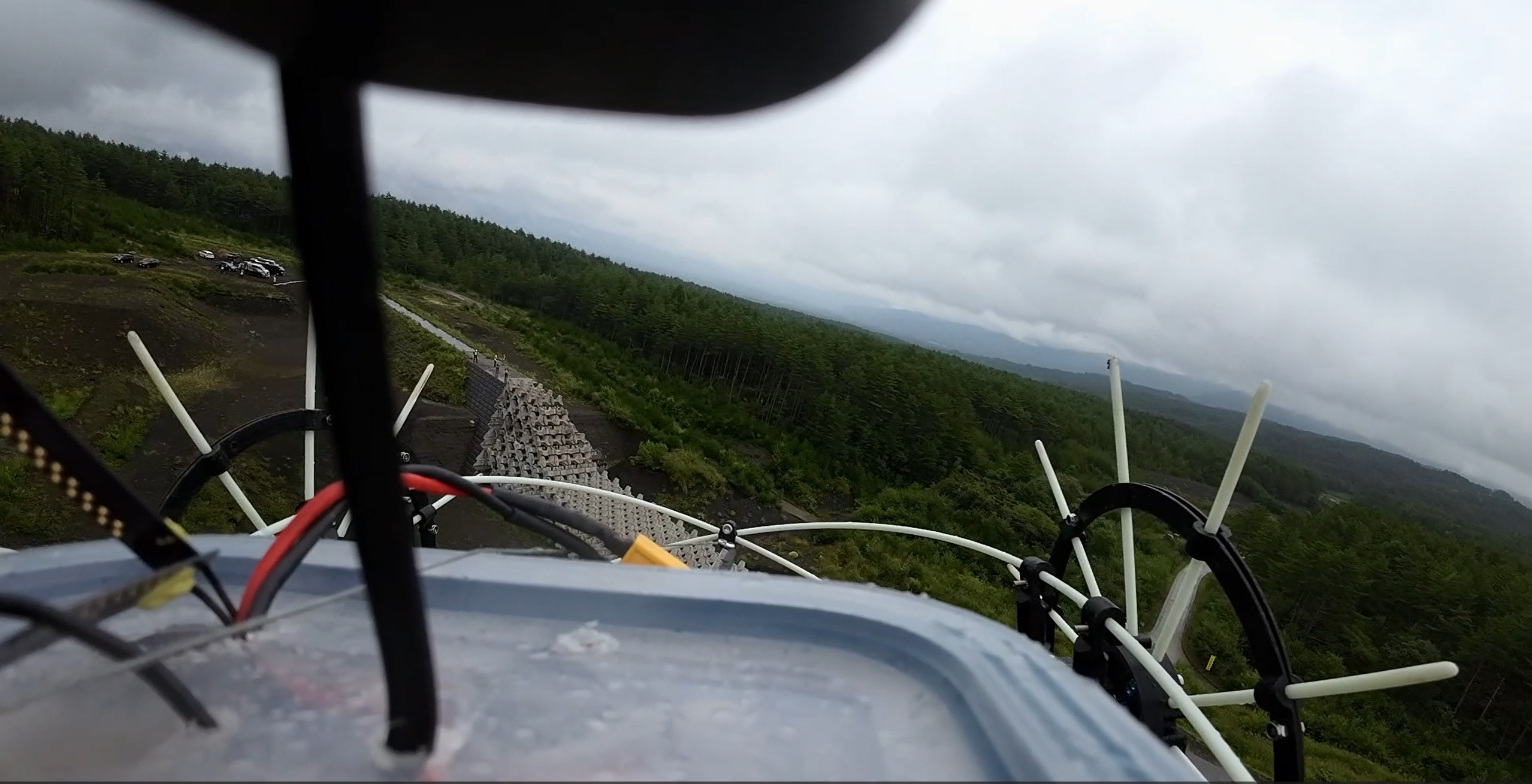 Over the summer, I developed a new prototype integrating first-person view (FPV) teleoperation and communications, and improved the overall mechanics of the robot. We evaluated different configurations and components in both the French Jura and volcanic terrain around Mount Asama, near Karuizawa, Japan. This culminated in a successful drone-deployed mission simulation in collaboration with scientists from the University of Tokyo, where the robot was air-dropped and navigated across rocky slopes, while I controlled it remotely using FPV.