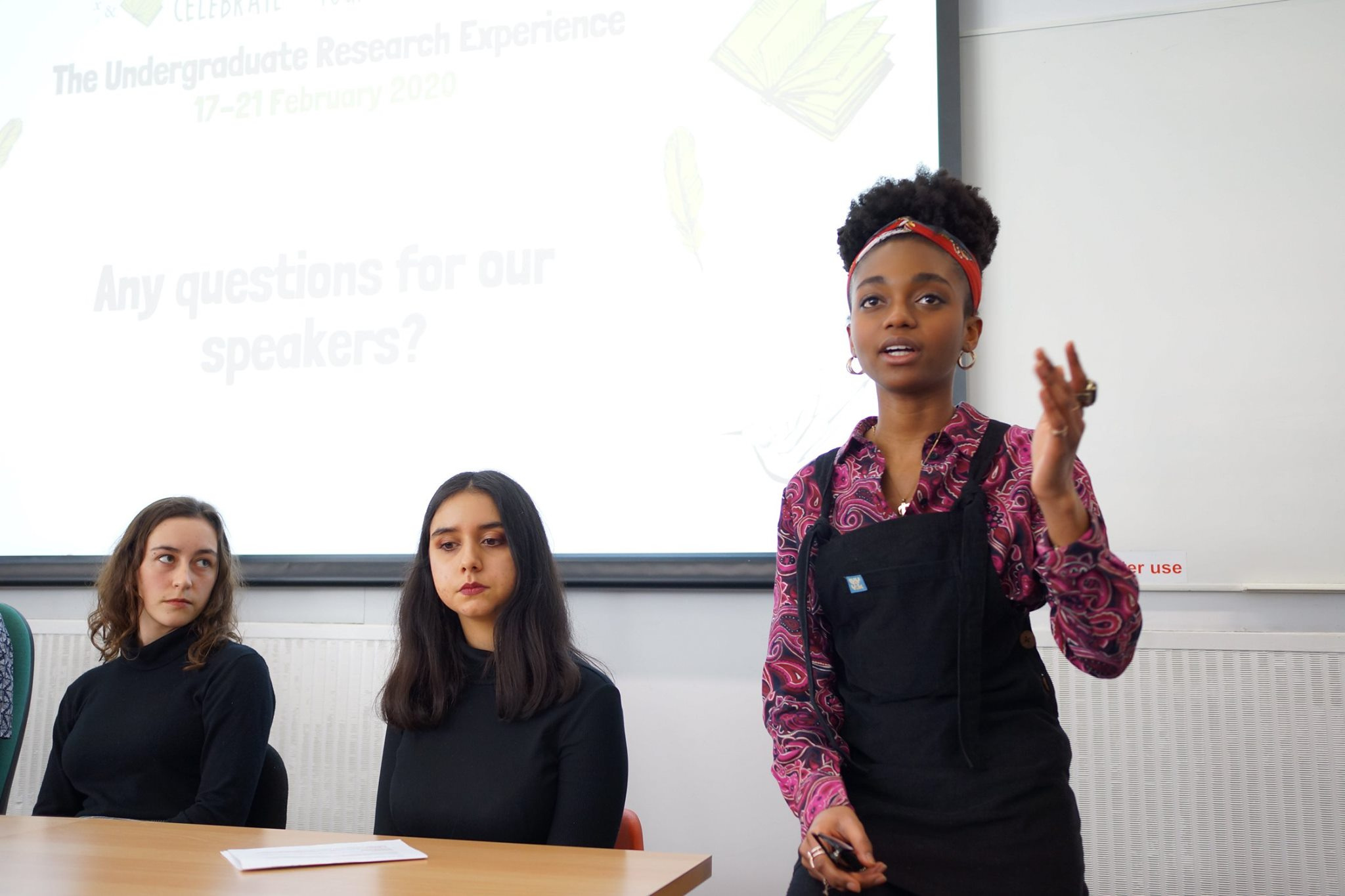 Farida answering questions about her research presentation at the Undergraduate Research Experience (UGRE) at the University of Leeds in February 2020.