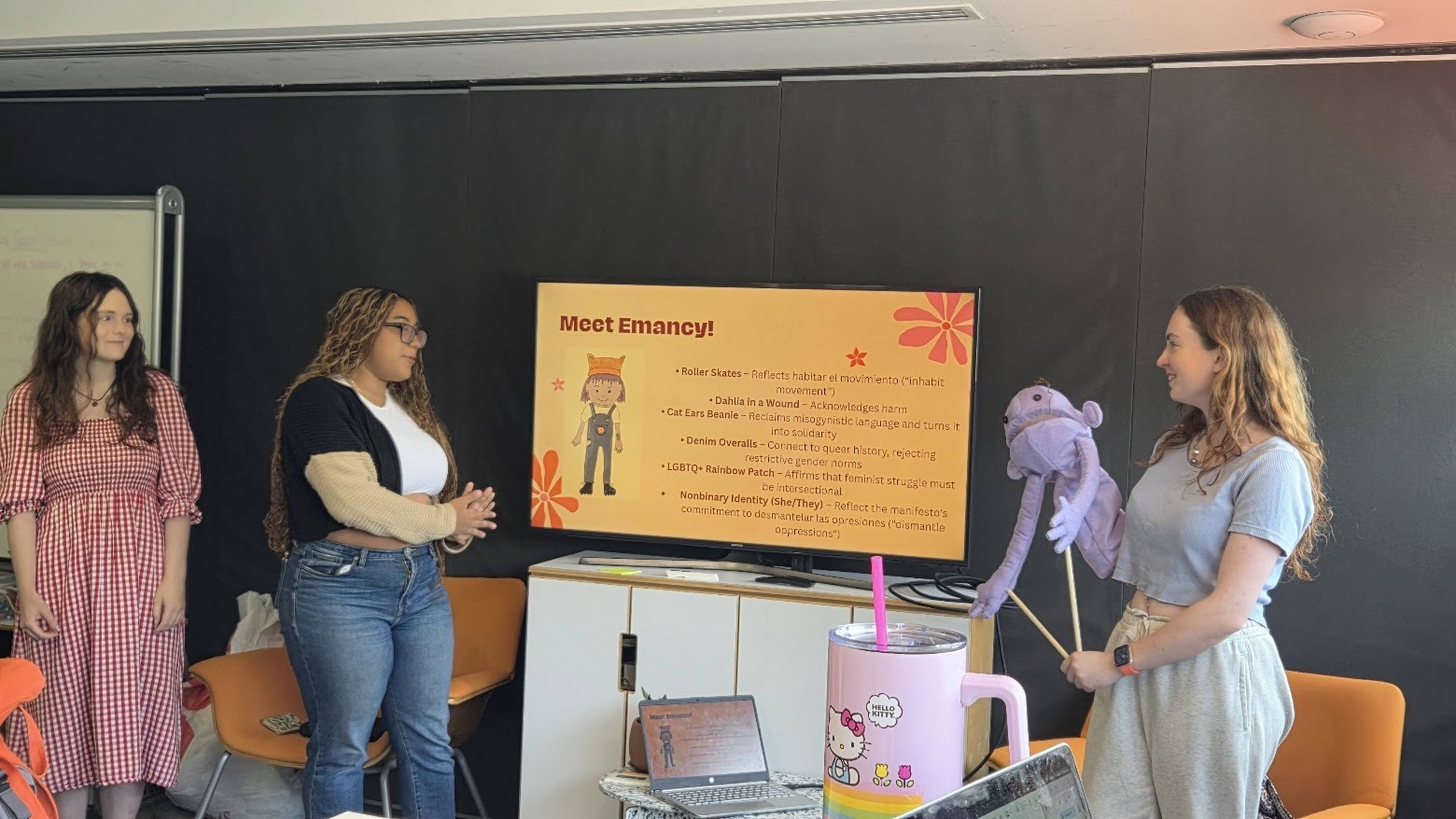 My LiA team and I practicing our end-of-project presentation, with the puppet we made, called Emancy!