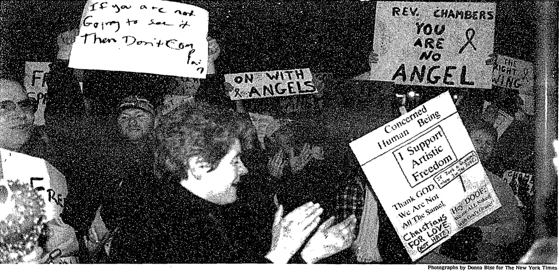 Image taken from the New York Times on 22 March 1996 showing protestors supporting a production of Angels being shown in Charlotte, North Carolina, following calls for it to be banned.