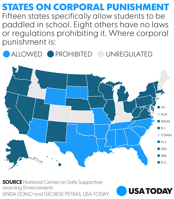 Map of the United States highlighting the states where corporal punishment in schools is still legal in 2020.