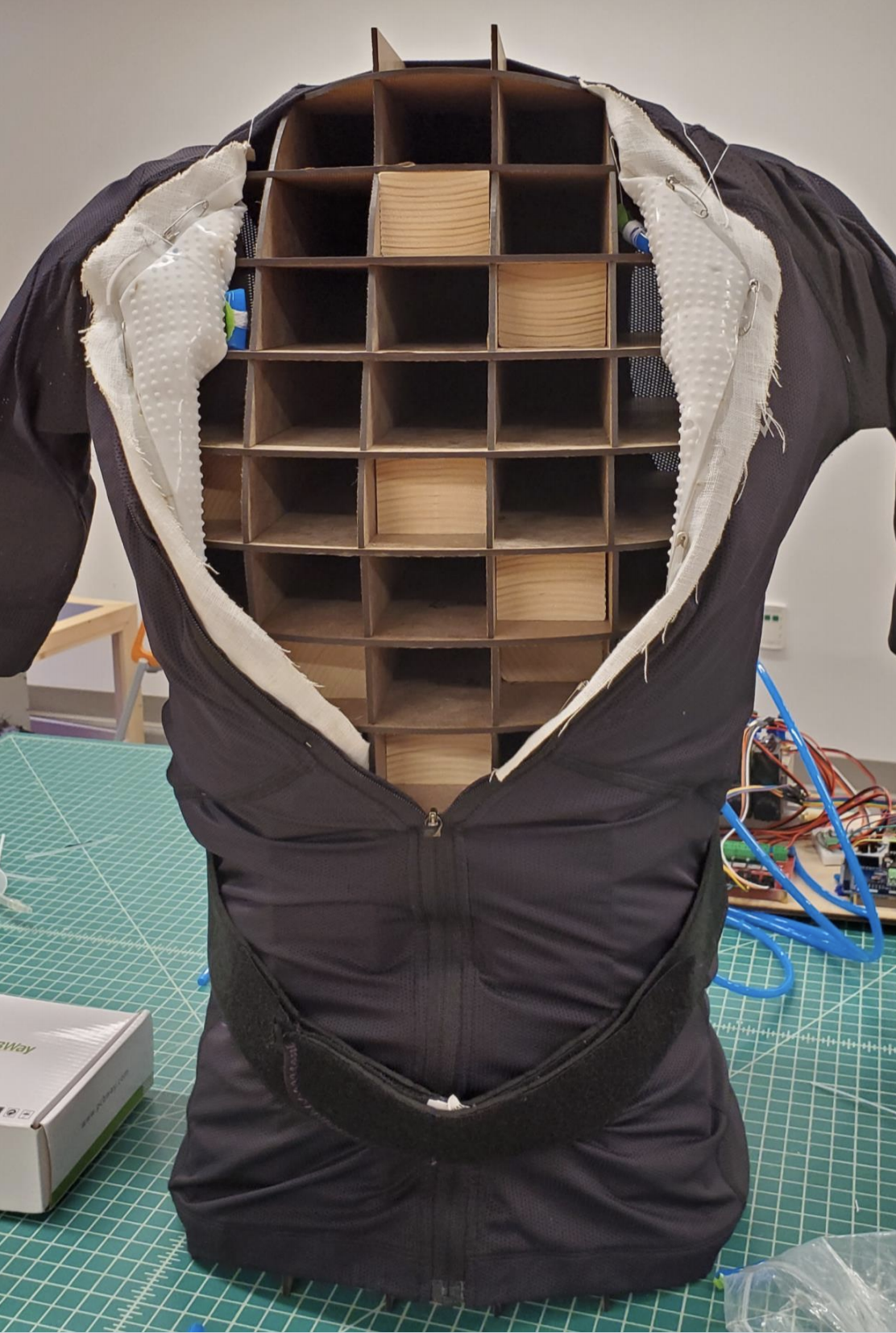 Unlike traditional posture correcting devices, the powering mechanism of this exoskeleton suit is made up of soft actuators. There are two parts to this project: the dynamics system provides personalized upper torso support without interfering with the user's autonomous motion, and the software interface uses a machine learning model to identify the user’s posture sequence and provide personalized feedback.