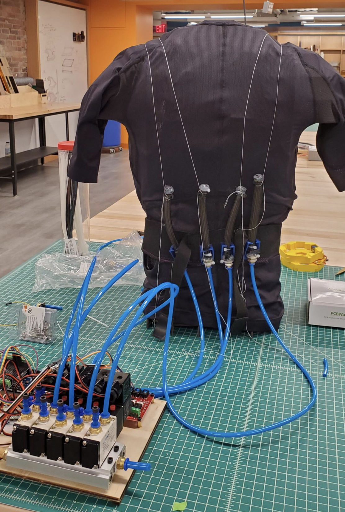 Unlike traditional posture correcting devices, the powering mechanism of this exoskeleton suit is made up of soft actuators. There are two parts to this project: the dynamics system provides personalized upper torso support without interfering with the user's autonomous motion, and the software interface uses a machine learning model to identify the user’s posture sequence and provide personalized feedback.