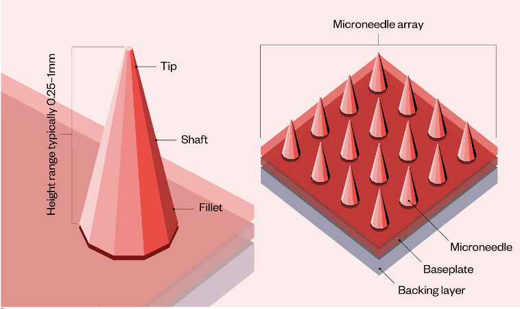 Array of microneedles on the patch. Adapted from Kulick, n.d.