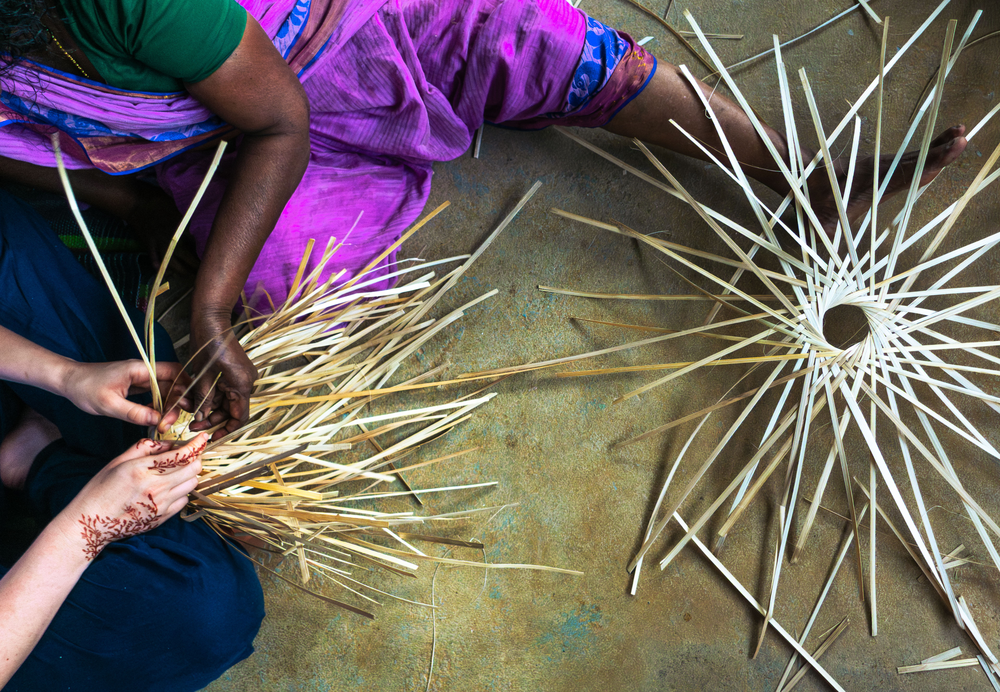 On our second day, we visited the reed-weaving cooperative in Thiruvananthapuram. The reed-weaving cooperative was based in a family home, where women gathered with their children to weave baskets and mats. Their process was intriguing–in addition to them being excellent weavers, it was also interesting to watch how they balanced working with childcare in real time. Many of the women sat children in their laps while weaving and childcare was shared among the cooperative, based on whoever was available at the moment.