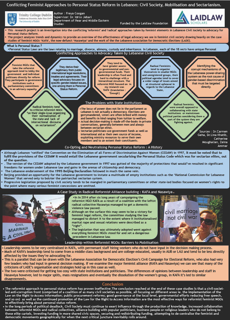 Hello all ! My name is Freya Coogan, I'm an undergraduate student in Trinity College Dublin studying Middle Eastern and European Languages and Cultures (with an emphasis on French and Arabic). I currently live in Beirut, Lebanon and my research focuses on the differing approaches to the reform of Personal Status Law taken by Feminist NGOs in Lebanon. I'm interested in the role of civil society in the push for the implementation of anti-corruption measures and transparency and am a proud member of the American University of Beirut's Secular Club. In my spare time I host radio shows on Trinity FM and Dublin City FM that are centred around social justice, current affairs and folklore !