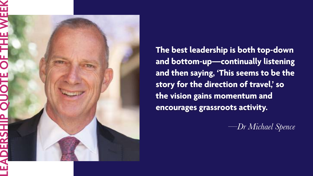 Dr Spence’s quote highlights a crucial aspect of leadership: the importance of balancing clear direction from leadership with the creativity and energy of grassroots efforts. His philosophy of active listening and bottom-up collaboration is a reminder that leadership is most effective when it encourages engagement, allowing individuals across all levels to contribute to the collective vision.