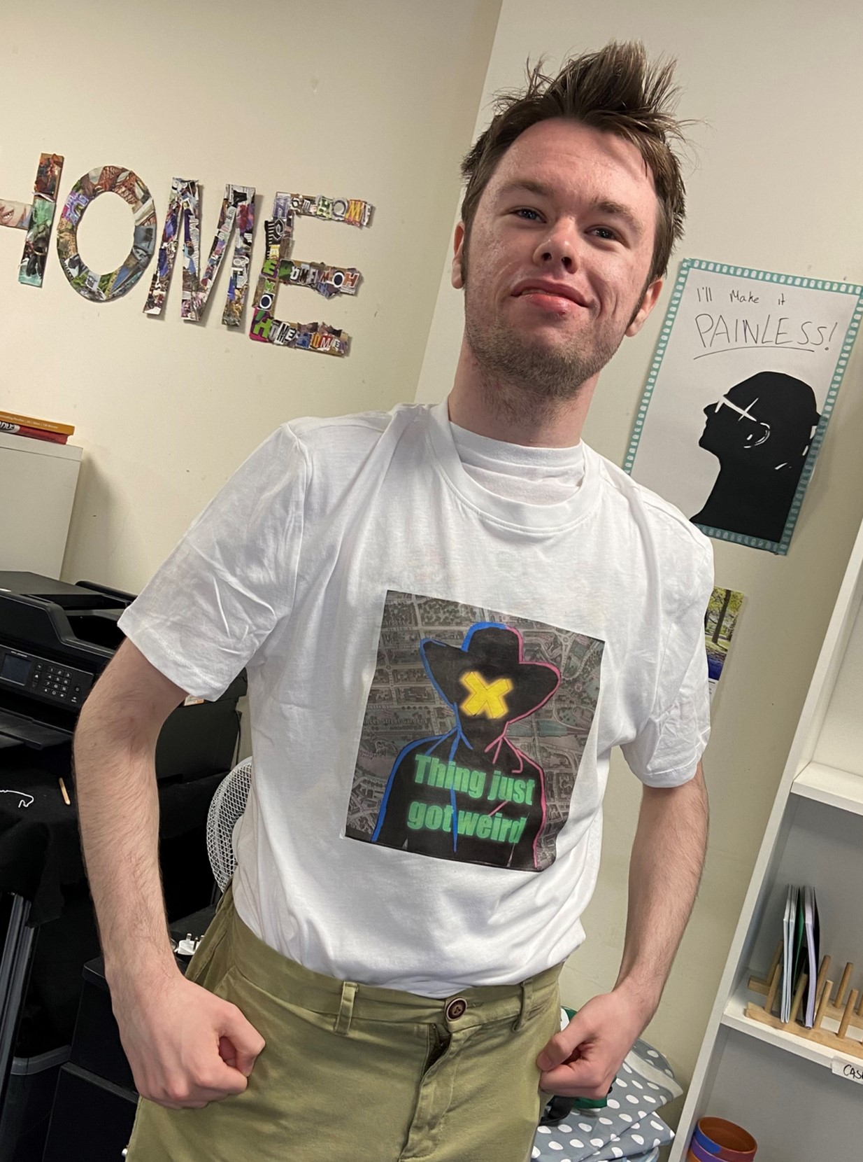 programme, modelling the custom t-shirt designed for the premiere.
