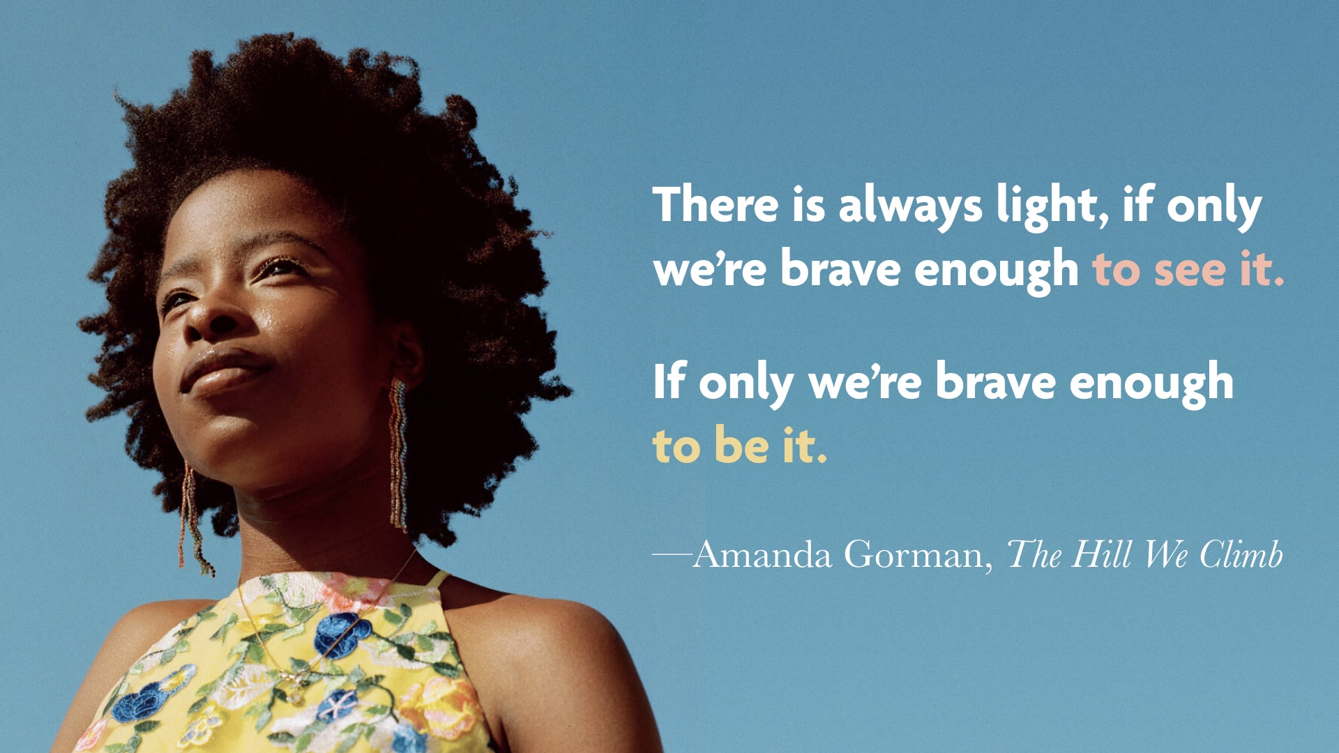 Amanda Gorman is an American poet, award-winning writer and cum laude graduate of Harvard University. She is the youngest inaugural poet in U.S. history: on January 20th, 2021, 22-year-old Gorman delivered her original poem, The Hill We Climb, during President Joe Biden's and VP Kamala Harris' inauguration.