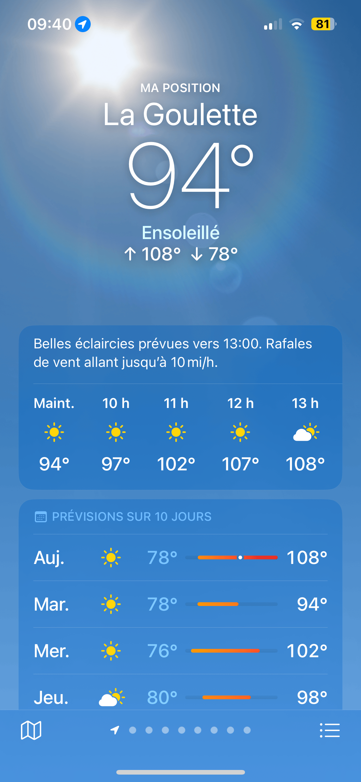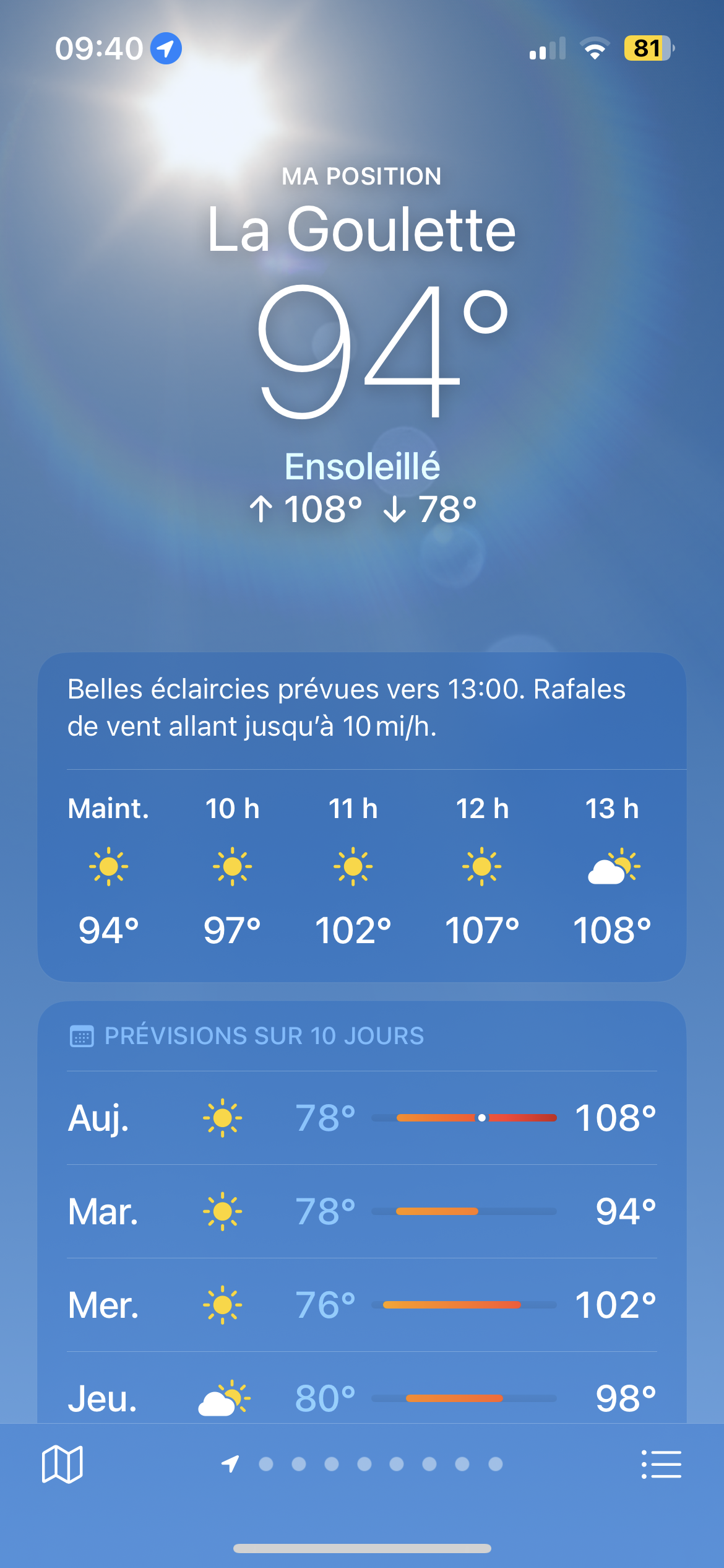 It’s cooled down a bit since last week, but in my conversations with taxi drivers, my host grandmother, really everyone I talk to (as you can imagine, the heat is a very common conversational topic), Tunisia has not always had this level of heat during the summers. My host grandmother said that it has really only been the past few years that the heat has been so unbearable and that the effects of climate change have been so evident. But it truly impacts every aspect of life here. I didn’t have to work on Monday, but for taxi drivers (the majority of whom do not have AC in their cars), for people without homes, for people who collect trash or work in construction, for any elderly or immunocompromised person, life during the waking hours is truly unsupportable. The city comes out at night, but for the working people of this world, the summer can be deadly.