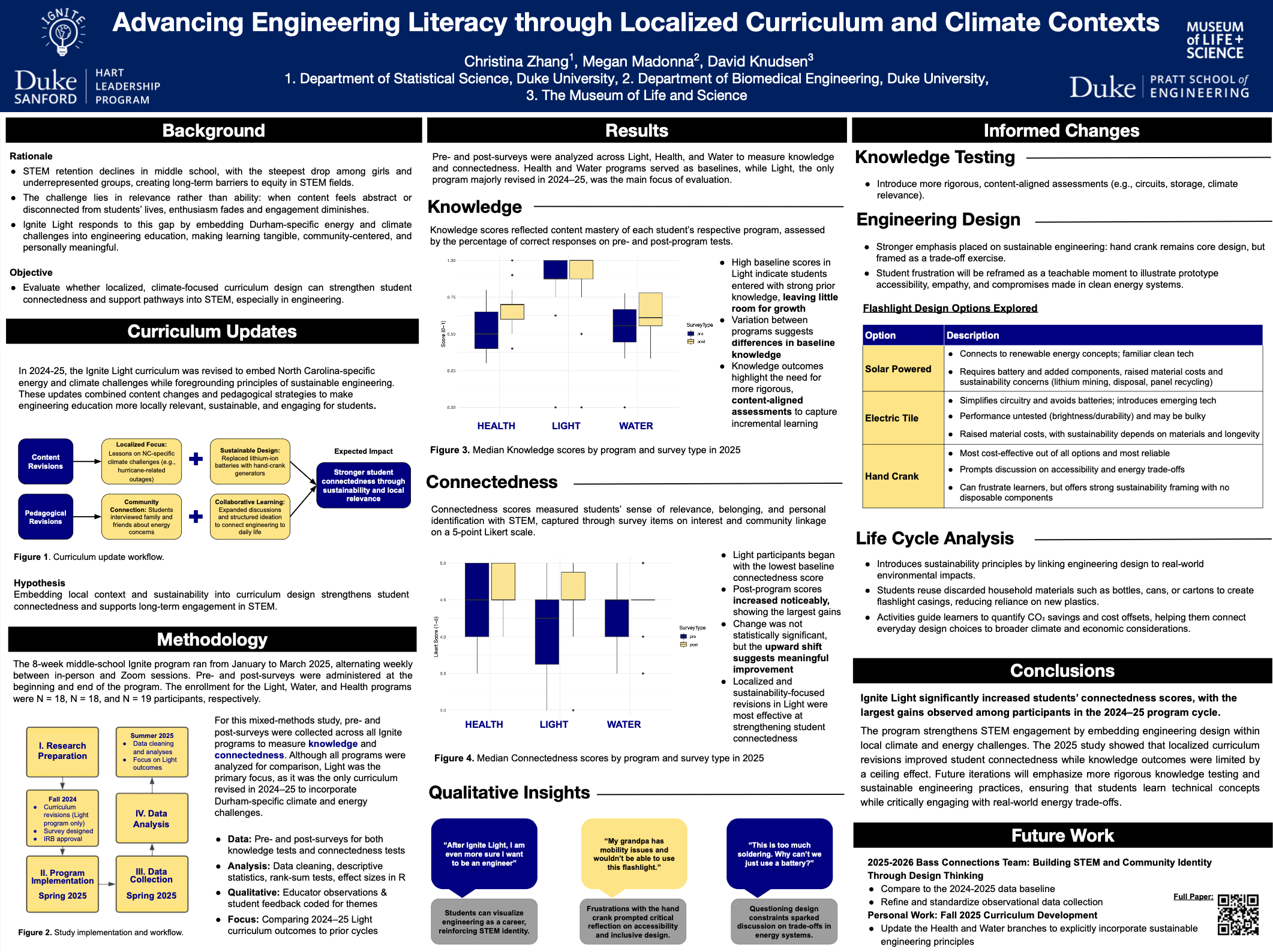 This poster examines how the Duke Ignite Light curriculum integrates localized climate and energy challenges to advance engineering literacy among middle school students. The project evaluates curriculum impacts and proposes revisions for future implementation.