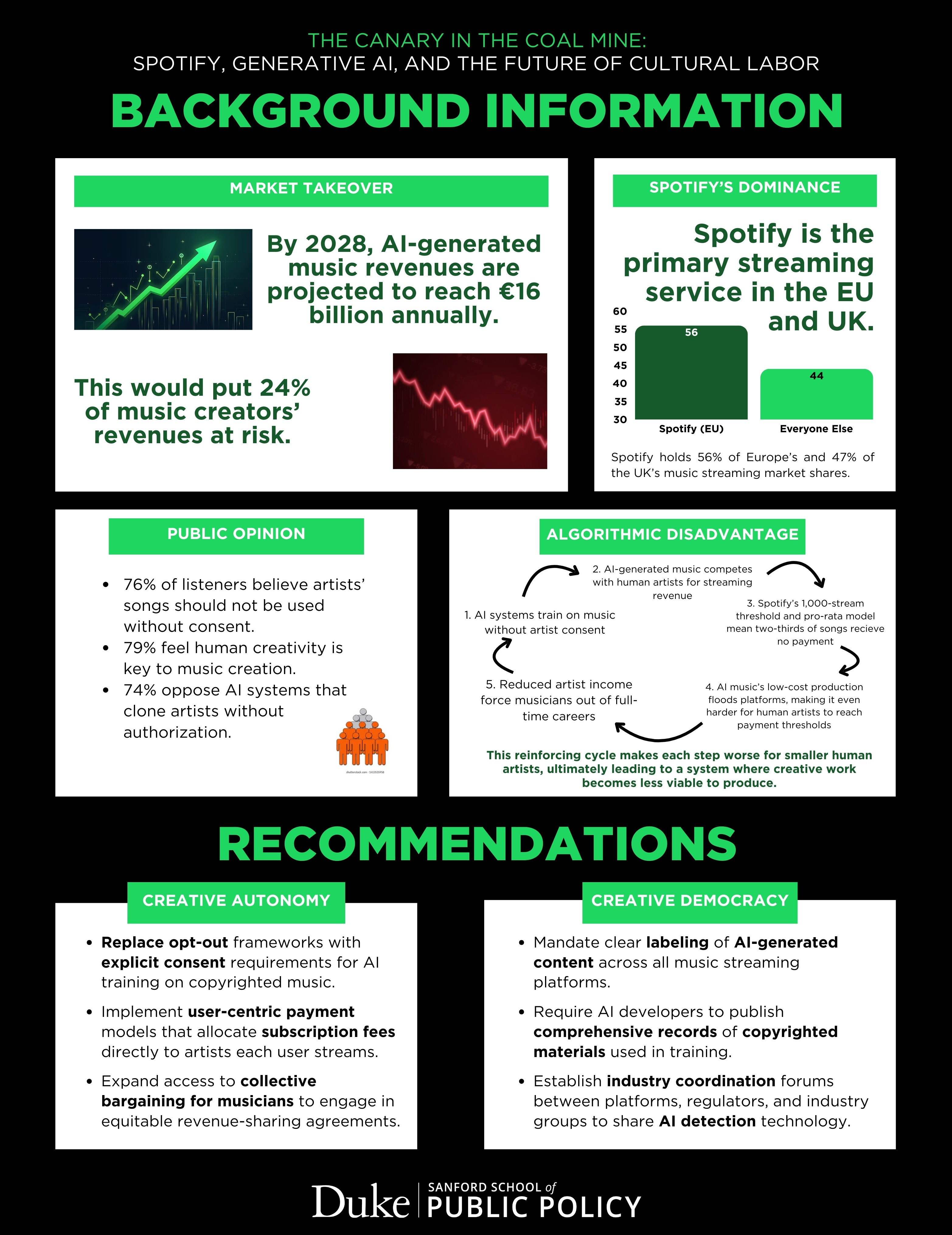 This infographic complements our research paper on “Spotify, Generative AI, and the Future of Creative Democracy,” distilling key background information and highlighting our policy recommendations to safeguard creative labor.