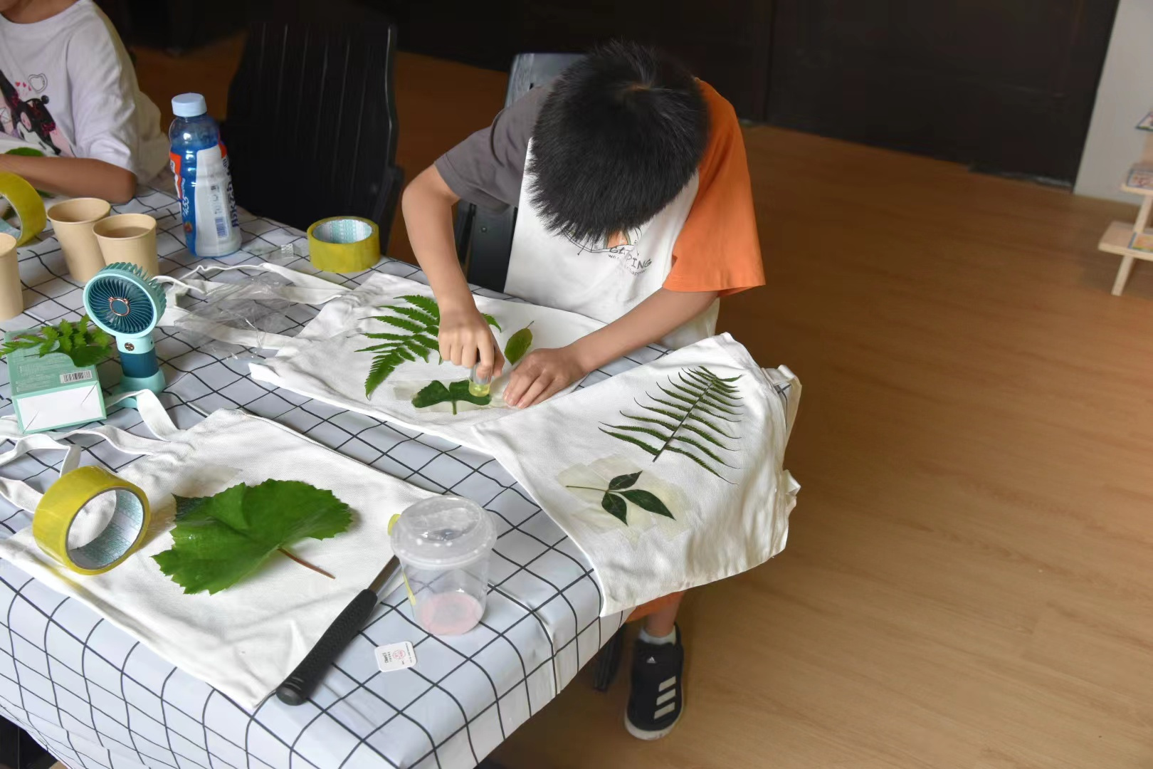 One child used red leaves, which resulted in brown leaf prints and veins, leaving an "autumn" color on the canvas bag. Another chose the southern "Bougainvillea," printing a bright pinkish-purple. Some children layered different leaves, using the overlapping and blending of colors to create a distinctive visual presentation.