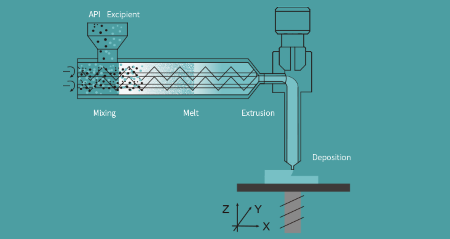 Fused Deposition Modeling (FDM) is the most common technique. And it can be explained by the simple demonstration down here. The active pharmaceutical ingredient (API) and structural polymers are extruded and printed. Yet one of its challenges is that the high temperature during printing may cause degradation of API. Read further here.