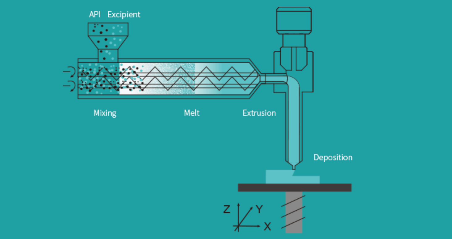 Fused Deposition Modeling (FDM) is the most common technique. And it can be explained by the simple demonstration down here. The active pharmaceutical ingredient (API) and structural polymers are extruded and printed. Yet one of its challenges is that the high temperature during printing may cause degradation of API. Read further here.