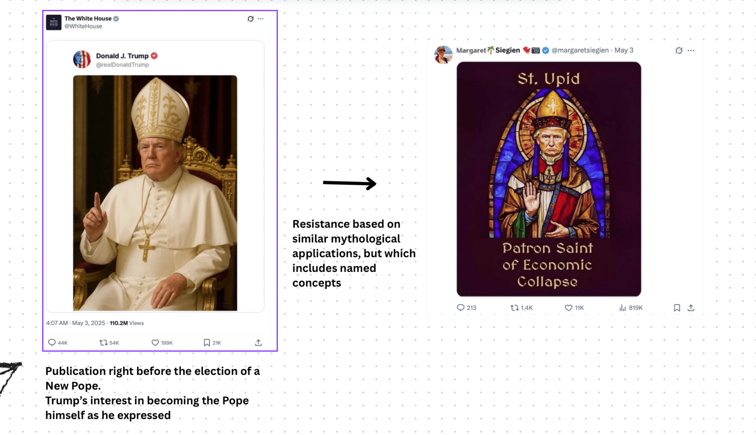 First, it is interesting to think of the modes of resistance to such influences, finding the possibility to break the linearity of mythological imagery and promoting the alternative agencies within it. Barthes' idea of the possible breakage of myth influence by naming its concept and the linguistic model of Dell Hymes (1974), which helps to analyse the language usages, allows to create a basis for such resistance work. The combination of such theories might produce a pattern that helps to reveal the hidden ideological structures people are affected by. The production of resistance media content, which will signify and mock structures of the initial ideological product, could grow into a separate project idea. The example to demonstrate this could be the comment under Trump's picture where he presents himself as a Pope (Fig. 1). The picture provided in response uses the same mythical structure, however, it explicitly names the key concepts that allow us to see presented reality from a different angle (‘Patron Saint of Economic Collapse’). Such knowledge could enhance the understanding of modern-day political influences, supporting communities and organisations in creating more effective campaigns of resistance to disinformation and manipulative content.